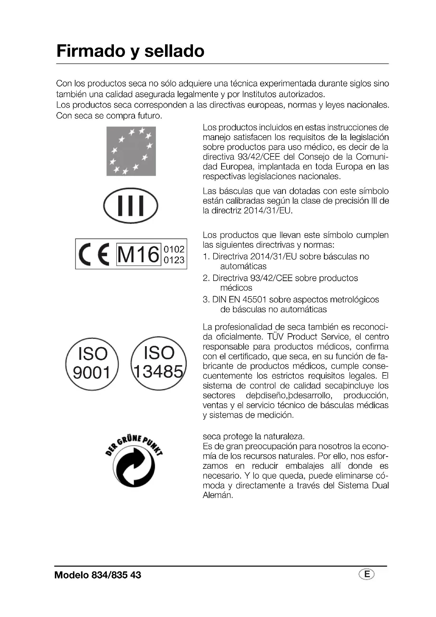 Firmado y sellado Con los productos seca no sólo adquiere una técnica experimentada durante siglos sino también una calidad asegurada legalmente y por Institutos autorizados. Los productos seca corresponden a las directivas europeas, normas y leyes nacionales. Con seca se compra futuro.Los productos incluidos en estas instrucciones de manejo satisfacen los requisitos de la legislación sobre productos para uso médico, es decir de la directiva 93/42/CEE del Consejo de la Comuni-dad Europea, implantada en toda Europa en las respectivas legislaciones nacionales.Las básculas que van dotadas con este símbolo están calibradas según la clase de precisión III de la directriz 2014/31/EU. Los productos que llevan este símbolo cumplen las siguientes directrivas y normas: 1. Directriva 2014/31/EU sobre básculas no automáticas2. Directriva 93/42/CEE sobre productos médicos3. DIN EN 45501 sobre aspectos metrológicos de básculas no automáticasLa profesionalidad de seca también es reconoci-da oficialmente. TÜV Product Service, el centro responsable para productos médicos, confirma con el certificado, que seca, en su función de fa-bricante de productos médicos, cumple conse-cuentemente los estrictos requisitos legales. El sistema de control de calidad secaþincluye los sectores deþdiseño,þdesarrollo, producción, ventas y el servicio técnico de básculas médicas y sistemas de medición.seca protege la naturaleza. Es de gran preocupación para nosotros la econo-mía de los recursos naturales. Por ello, nos esfor-zamos en reducir embalajes allí donde es necesario. Y lo que queda, puede eliminarse có-moda y directamente a través del Sistema Dual Alemán.
