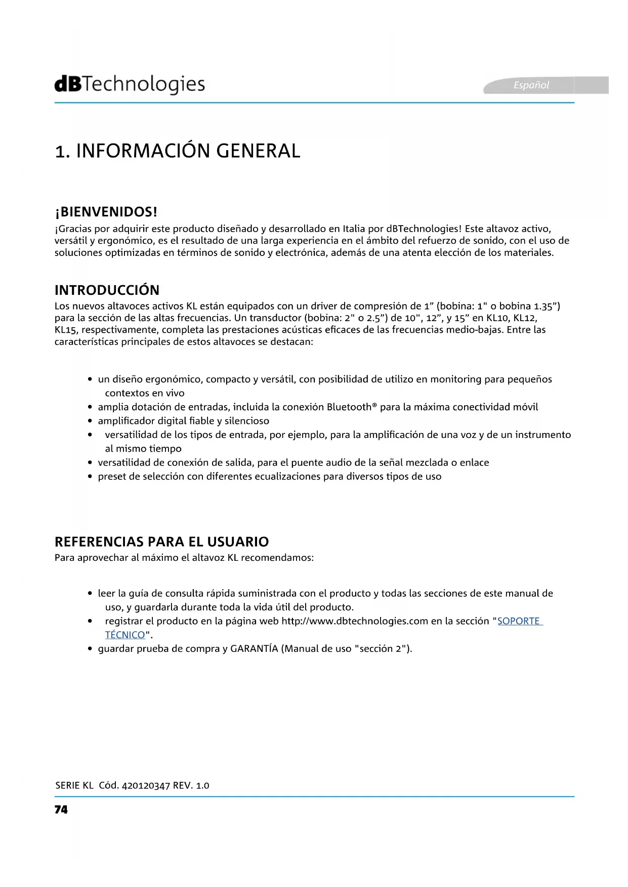¡Gracias por adquirir este producto diseñado y desarrollado en Italia por dBTechnologies! Este altavoz activo, versátil y ergonómico, es el resultado de una larga experiencia en el ámbito del refuerzo de sonido, con el uso de soluciones optimizadas en términos de sonido y electrónica, además de una atenta elección de los materiales. Los nuevos altavoces activos KL están equipados con un driver de compresión de 1” (bobina: 1" o bobina 1.35”) para la sección de las altas frecuencias. Un transductor (bobina: 2" o 2.5”) de 10", 12”, y 15” en KL10, KL12, KL15, respectivamente, completa las prestaciones acústicas ecaces de las frecuencias medio-bajas. Entre las características principales de estos altavoces se destacan: Para aprovechar al máximo el altavoz KL recomendamos: