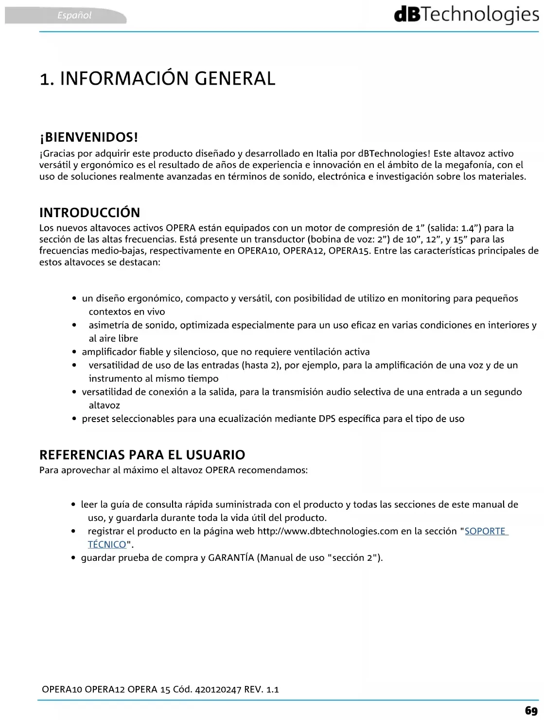 ¡Gracias por adquirir este producto diseñado y desarrollado en Italia por dBTechnologies! Este altavoz activo versátil y ergonómico es el resultado de años de experiencia e innovación en el ámbito de la megafonía, con el uso de soluciones realmente avanzadas en términos de sonido, electrónica e investigación sobre los materiales. Los nuevos altavoces activos OPERA están equipados con un motor de compresión de 1” (salida: 1.4”) para la sección de las altas frecuencias. Está presente un transductor (bobina de voz: 2”) de 10”, 12”, y 15” para las frecuencias medio-bajas, respectivamente en OPERA10, OPERA12, OPERA15. Entre las características principales de estos altavoces se destacan: Para aprovechar al máximo el altavoz OPERA recomendamos: