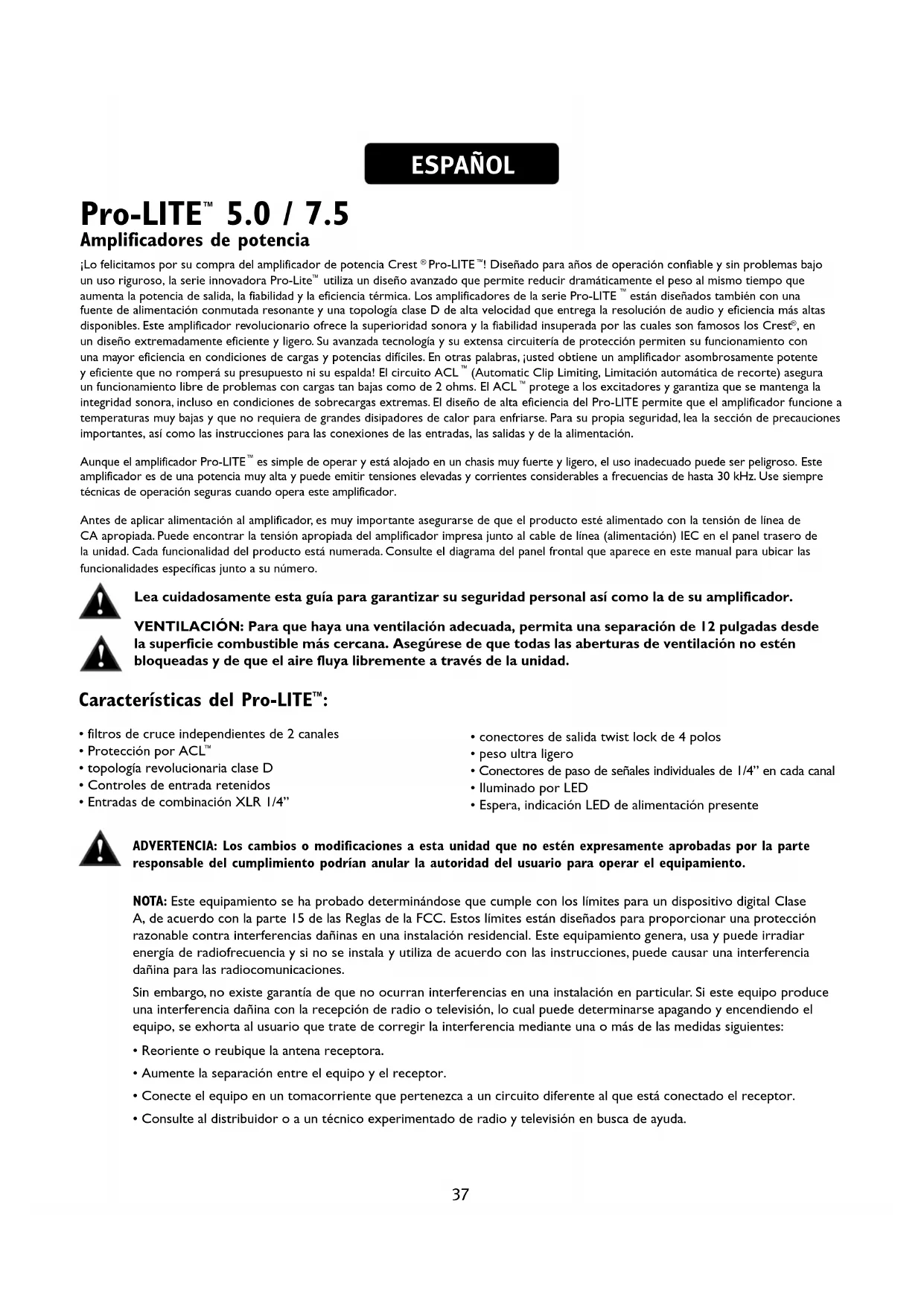 , en un diseño extremadamente eficiente y ligero. Su avanzada tecnología y su extensa circuitería de protección permiten su funcionamiento con una mayor eficiencia en condiciones de cargas y potencias difíciles. En otras palabras, ¡usted obtiene un amplificador asombrosamente potente y eficiente que no romperá su presupuesto ni su espalda! El circuito ACL (Automatic Clip Limiting, Limitación automática de recorte) asegura un funcionamiento libre de problemas con cargas tan bajas como de 2 ohms. El ACL protege a los excitadores y garantiza que se mantenga la integridad sonora, incluso en condiciones de sobrecargas extremas. El diseño de alta eficiencia del Pro-LITE permite que el amplificador funcione a temperaturas muy bajas y que no requiera de grandes disipadores de calor para enfriarse. Para su propia seguridad, lea la sección de precauciones importantes, así como las instrucciones para las conexiones de las entradas, las salidas y de la alimentación. Aunque el amplificador Pro-LITE es simple de operar y está alojado en un chasis muy fuerte y ligero, el uso inadecuado puede ser peligroso. Este amplificador es de una potencia muy alta y puede emitir tensiones elevadas y corrientes considerables a frecuencias de hasta 30 kHz. Use siempre técnicas de operación seguras cuando opera este amplificador. Antes de aplicar alimentación al amplificador, es muy importante asegurarse de que el producto esté alimentado con la tensión de línea de CA apropiada. Puede encontrar la tensión apropiada del amplificador impresa junto al cable de línea (alimentación) IEC en el panel trasero de la unidad. Cada funcionalidad del producto está numerada. Consulte el diagrama del panel frontal que aparece en este manual para ubicar las funcionalidades específicas junto a su número. Lea cuidadosamente esta guía para garantizar su seguridad personal así como la de su amplificador. VENTILACIÓN: Para que haya una ventilación adecuada, permita una separación de 12 pulgadas desde la superficie combustible más cercana. Asegúrese de que todas las aberturas de ventilación no estén bloqueadas y de que el aire fluya libremente a través de la unidad. ESPAÑOL Características del Pro-LITE