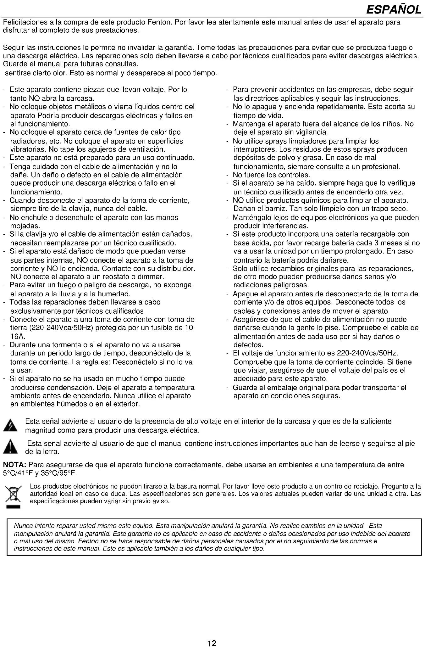 Nunca intente reparar usted mismo este equipo. Esta manipulación anulará la garantía. No realice cambios en la unidad. Esta manipulación anulará la garantía. Esta garantía no es aplicable en caso de accidente o daños ocasionados por uso indebido del aparato o mal uso del mismo. Fenton no se hace responsable de daños personales causados por el no seguimiento de las normas e instrucciones de este manual. Esto es aplicable también a los daños de cualquier tipo.13