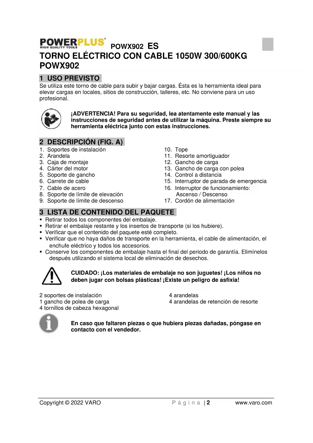 Copyright © 2022 VARO P á g i n a | 2 www.varo.com TORNO ELÉCTRICO CON CABLE 1050W 300/600KG POWX902 1 USO PREVISTO Se utiliza este torno de cable para subir y bajar cargas. Ésta es la herramienta ideal para elevar cargas en locales, sitios de construcción, talleres, etc. No conviene para un uso profesional. ¡ADVERTENCIA! Para su seguridad, lea atentamente este manual y las instrucciones de seguridad antes de utilizar la máquina. Preste siempre su herramienta eléctrica junto con estas instrucciones. 2 DESCRIPCIÓN (FIG. A)