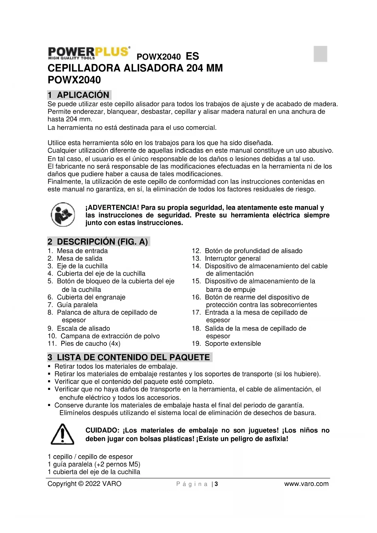 - Conserve durante los materiales de embalaje hasta el final del periodo de garantía. Elimínelos después utilizando el sistema local de eliminación de desechos de basura. CUIDADO: ¡Los materiales de embalaje no son juguetes! ¡Los niños no deben jugar con bolsas plásticas! ¡Existe un peligro de asfixia! 1 cepillo / cepillo de espesor 1 guía paralela (+2 pernos M5) 1 cubierta del eje de la cuchillaPOWX2040 ES Copyright © 2022 VARO P á g i n a | 4 www.varo.com 1 brazo de la cubierta del eje de la cuchilla (+ 1 tornillo y arandela + 1 perno M6 y tuerca mariposa) 1 tuerca mariposa de la cubierta del eje de la cuchilla 1 campana de extracción de polvo 1 adaptador de extracción de polvo de 100 mm 2 almohadillas de pulsador 1 barra de empuje 4 pies de caucho (+4 pernos M8 y arandelas) 1 plantilla de ajuste de la cuchilla 3 llaves hexagonales (4, 5 y 6 mm) 1 palanca de altura de cepillado de espesor 1 botón de bloqueo de la cubierta del eje de la cuchilla (+arandela) 1 manual En el caso que falten piezas o que haya piezas dañadas, póngase en contacto con el vendedor. 4 SÍMBOLOS En este manual y/o en el aparato mismo se utilizan los siguientes símbolos: