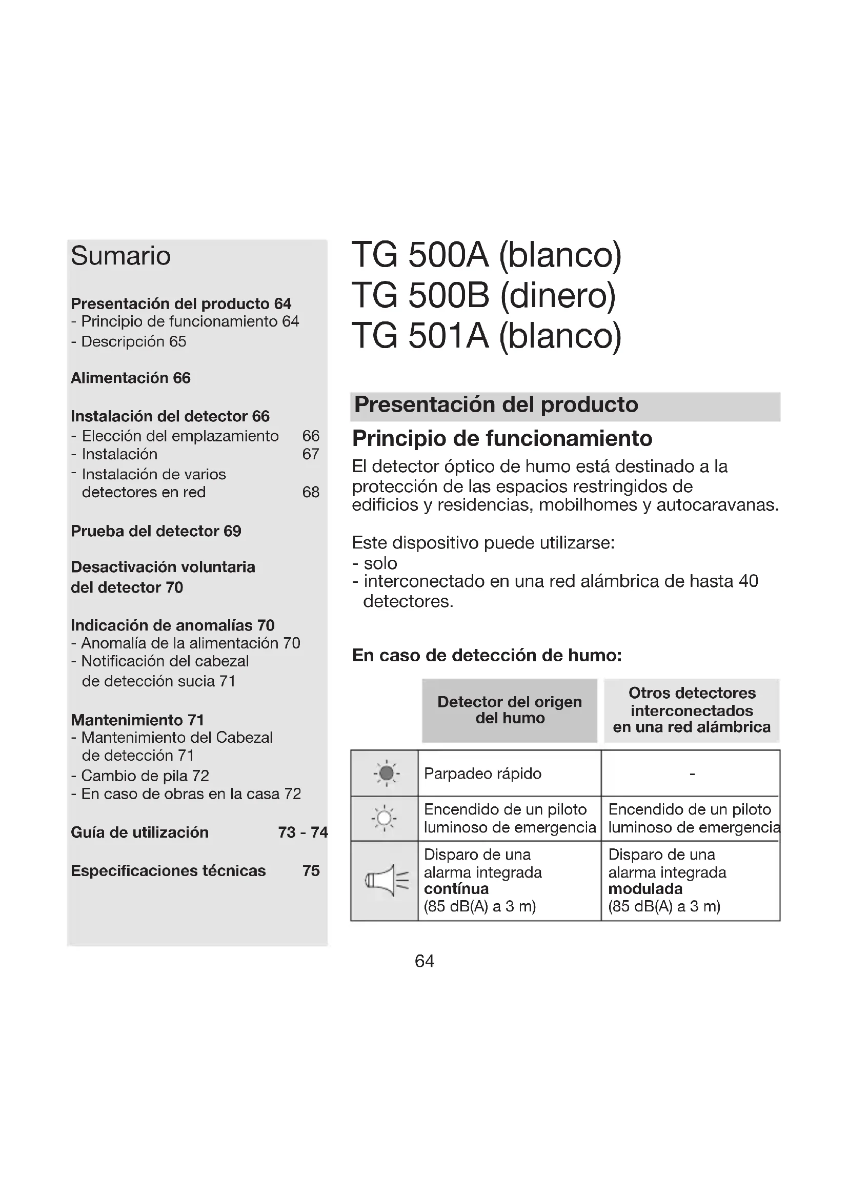 Prueba del detector 69 Desactivación voluntaria del detector 70 Indicación de anomalías 70 - Anomalía de la alimentación 70 - Notificación del cabezal de detección sucia 71 Mantenimiento 71 - Mantenimiento del Cabezal de detección 71 - Cambio de pila 72 - En caso de obras en la casa 72 Guía de utilización 73 - 74 Especificaciones técnicas 75 TG 500A (blanco) TG 500B (dinero) TG 501A (blanco) Principio de funcionamiento El detector óptico de humo está destinado a la protección de las espacios restringidos de edificios y residencias, mobilhomes y autocaravanas. Este dispositivo puede utilizarse: - solo - interconectado en una red alámbrica de hasta 40 detectores. En caso de detección de humo: Presentación del producto65