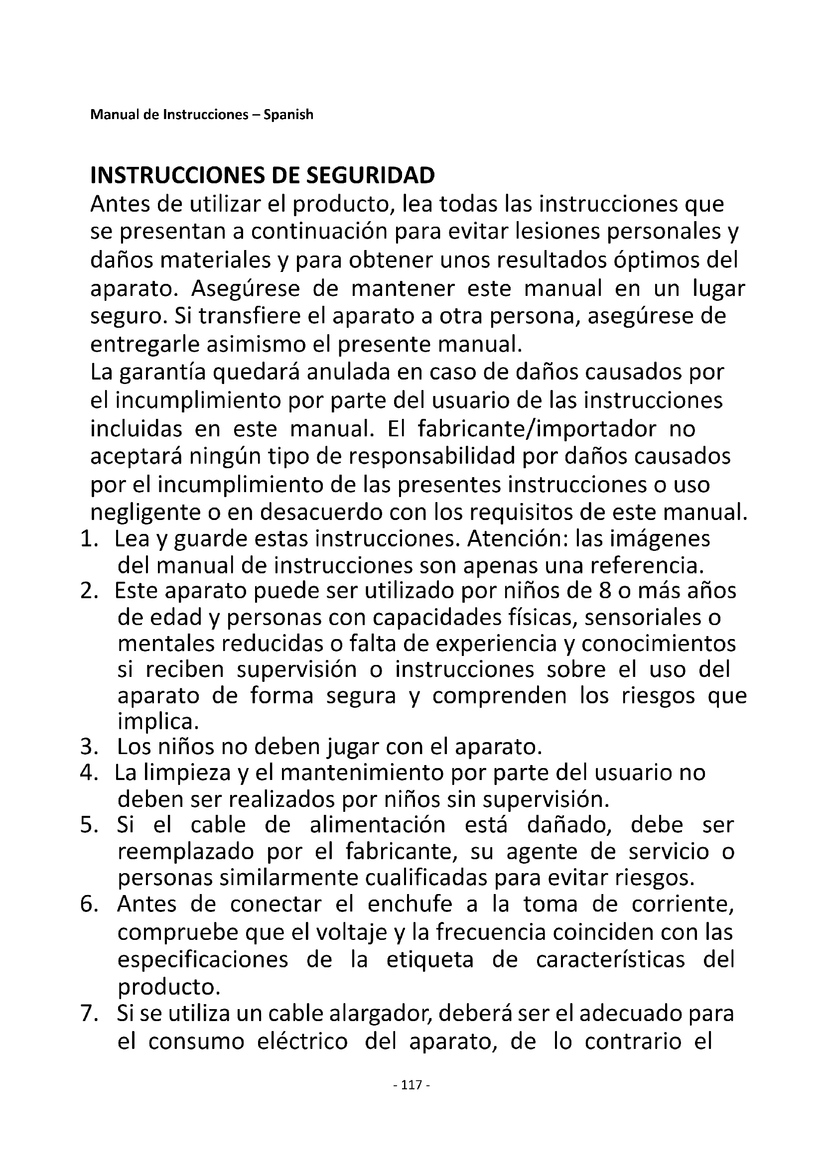 Antes de utilizar el producto, lea todas las instrucciones que se presentan a continuación para evitar lesiones personales y daños materiales y para obtener unos resultados óptimos del aparato. Asegúrese de mantener este manual en un lugar seguro. Si transfiere el aparato a otra persona, asegúrese de entregarle asimismo el presente manual. La garantía quedará anulada en caso de daños causados por el incumplimiento por parte del usuario de las instrucciones incluidas en este manual. El fabricante/importador no aceptará ningún tipo de responsabilidad por daños causados por el incumplimiento de las presentes instrucciones o uso negligente o en desacuerdo con los requisitos de este manual.
