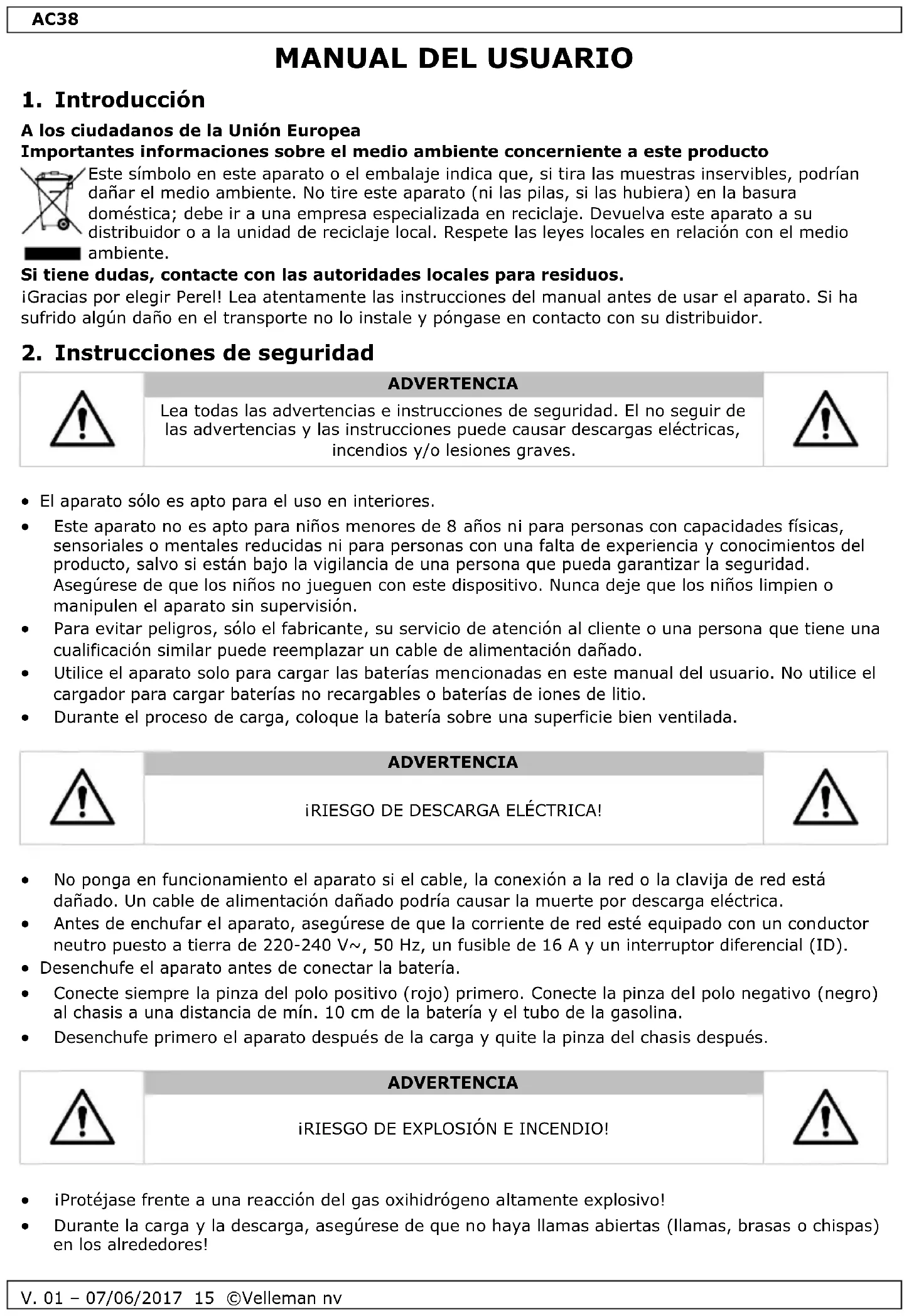 Velleman NV dispone de los derechos de autor para este manual del usuario. Todos los derechos mundiales reservados. Está estrictamente prohibido reproducir, traducir, copiar, editar y guardar este manual del usuario o partes de ello sin el consentimiento previo por escrito del propietario del copyright.AC38