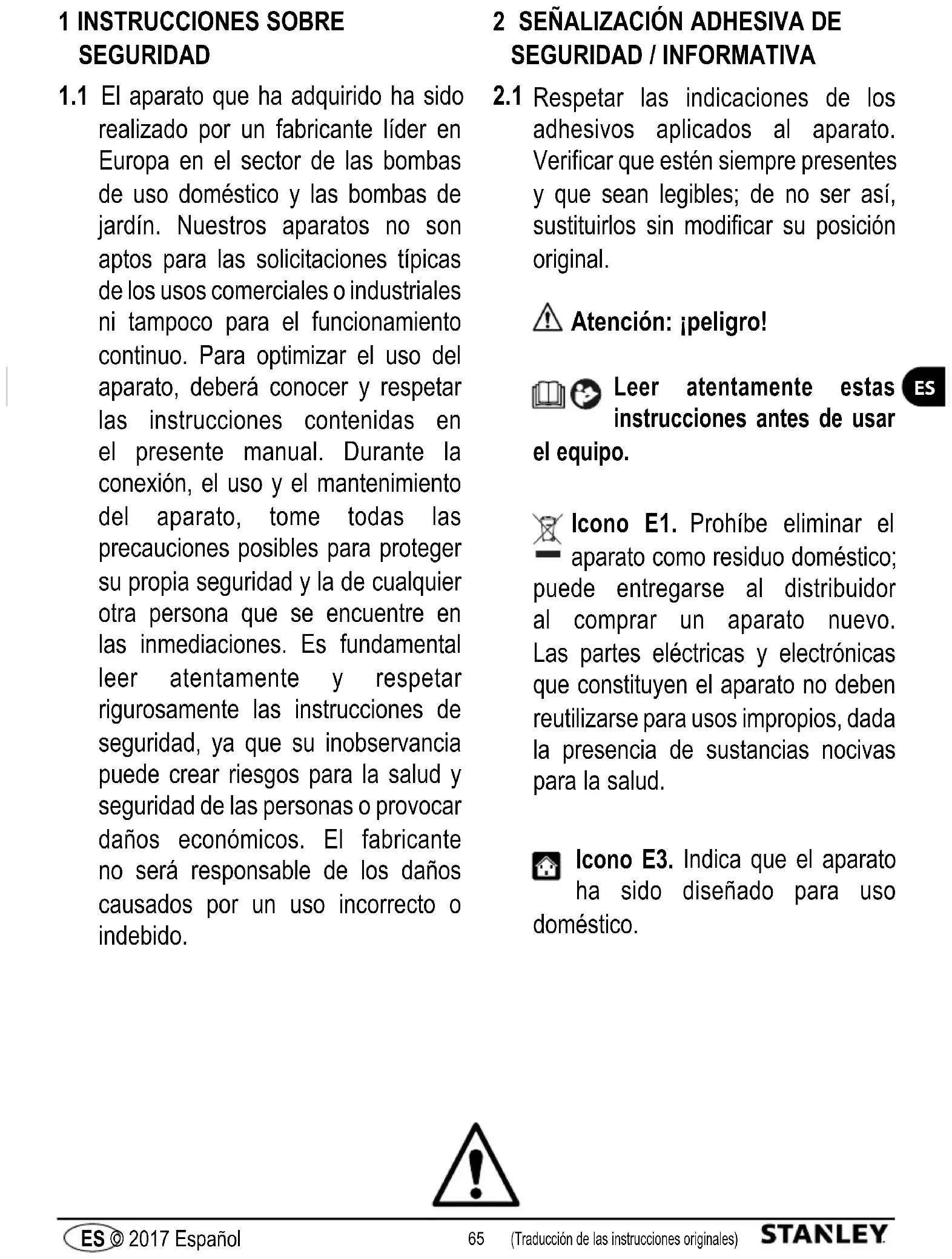 Respetar las indicaciones de los adhesivos aplicados al aparato. Verificar que estén siempre presentes y que sean legibles; de no ser así, sustituirlos sin modificar su posición original. Atención: ¡peligro! Leer atentamente estas instrucciones antes de usar el equipo. Icono E1. Prohíbe eliminar el aparato como residuo doméstico; puede entregarse al distribuidor al comprar un aparato nuevo. Las partes eléctricas y electrónicas que constituyen el aparato no deben reutilizarse para usos impropios, dada la presencia de sustancias nocivas para la salud. Icono E3. Indica que el aparato ha sido diseñado para uso doméstico.66 (Traducción de las instrucciones originales) ES © 2017 Español