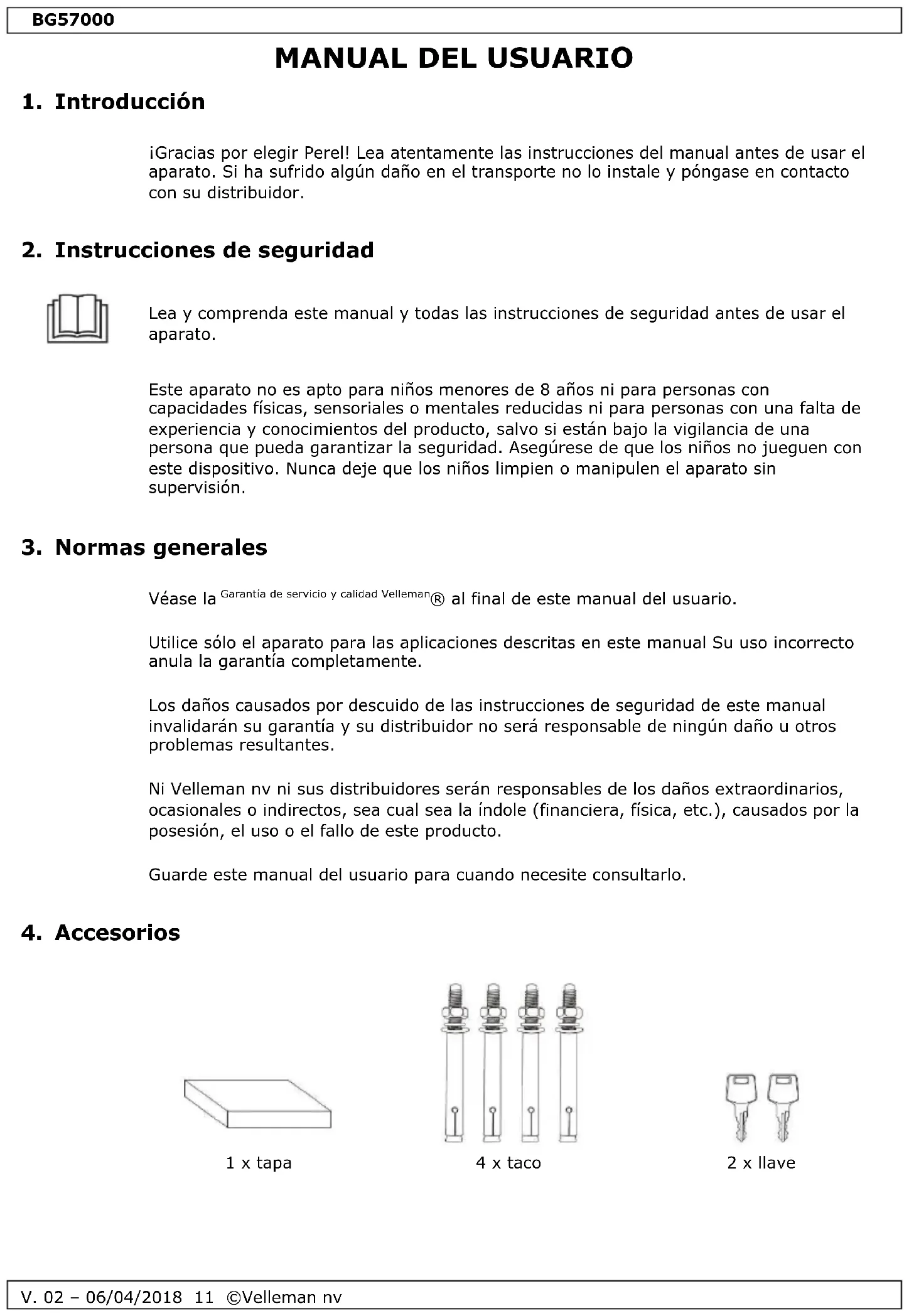 Utilice este aparato sólo con los accesorios originales. Velleman NV no será responsable de daños ni lesiones causados por un uso (indebido) de este aparato. Para más información sobre este producto y la versión más reciente de este manual del usuario, visite nuestra página www.perel.eu. Se pueden modificar las especificaciones y el contenido de este manual sin previo aviso.