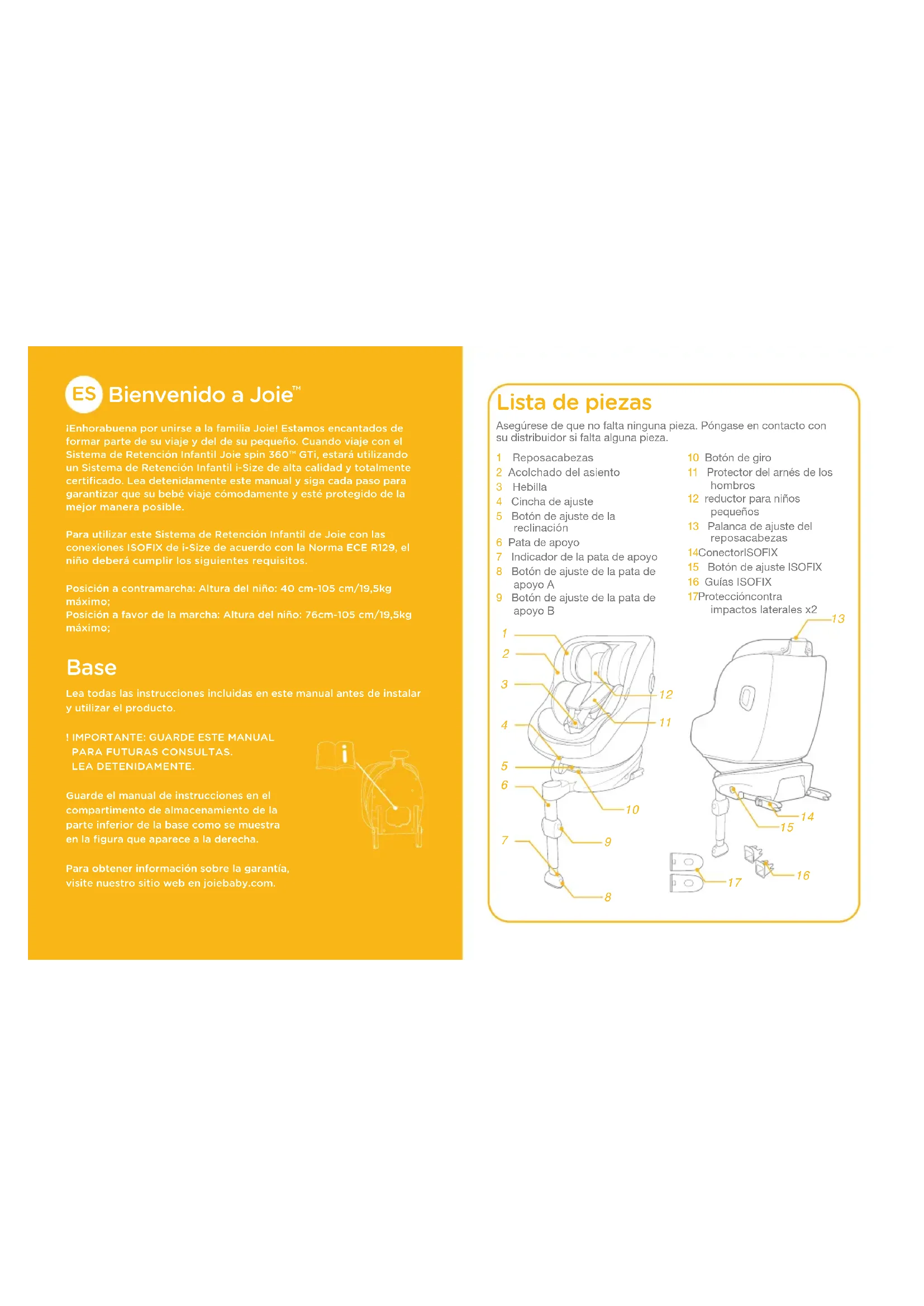 ¡Enhorabuena por unirse a la familia Joie! Estamos encantados de formar parte de su viaje y del de su pequeño. Cuando viaje con el Sistema de Retención Infantil Joie spin 360™ GTi, estará utilizando un Sistema de Retención Infantil i-Size de alta calidad y totalmente certificado. Lea detenidamente este manual y siga cada paso para garantizar que su bebé viaje cómodamente y esté protegido de la mejor manera posible.Para utilizar este Sistema de Retención Infantil de Joie con las conexiones ISOFIX de i-Size de acuerdo con la Norma ECE R129, el niño deberá cumplir los siguientes requisitos.Posición a contramarcha: Altura del niño: 40 cm-105cm/19,5kg máximo;Posición a favor de la marcha: Altura del niño: 76cm-105cm/19,5kg máximo; Base Lea todas las instrucciones incluidas en este manual antes de instalar y utilizar el producto.! IMPORTANTE: GUARDE ESTE MANUAL PARA FUTURAS CONSULTAS.LEA DETENIDAMENTE.Guarde el manual de instrucciones en el compartimento de almacenamiento de la parte inferior de la base como se muestra en la figura que aparece a la derecha.Para obtener información sobre la garantía, visite nuestro sitio web en joiebaby.com. Lista de piezas 1 Reposacabezas2 Acolchado del asiento3 Hebilla4 Cincha de ajuste5 Botón de ajuste de la reclinación6 Pata de apoyo7 Indicador de la pata de apoyo8 Botón de ajuste de la pata de apoyo A9 Botón de ajuste de la pata de apoyo B10 Botón de giro11 Protector del arnés de los hombros12 reductor para niños pequeños 13 Palanca de ajuste del reposacabezas14 Conector ISOFIX15 Botón de ajuste ISOFIX16 Guías ISOFIX17 Protección contra impactos laterales x2Asegúrese de que no falta ninguna pieza. Póngase en contacto con su distribuidor si falta alguna pieza.