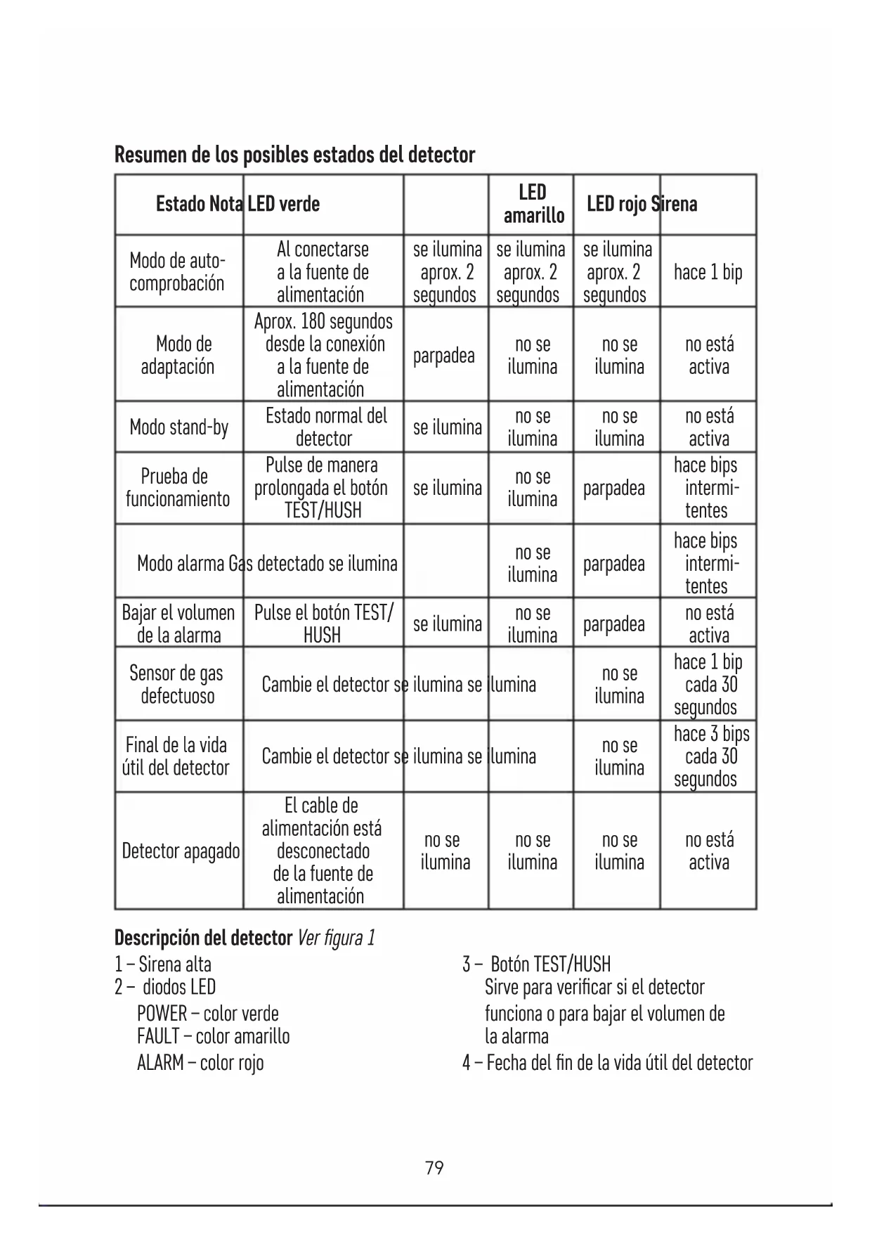 - Questo apparecchio non è destinato all’uso da parte di persone (compresi i bambini) le cui incapacità siche, sensoriali o mentali o la cui mancanza di esperienza o di conoscenze impediscono loro di utilizzare l’apparecchio in modo sicuro, a meno che non siano sorvegliate o istruite sull’uso di questo apparecchio da una persona responsabile della loro sicurezza. È necessario tenere d’occhio i bambini per assicurarsi che non giochino con l’apparecchio. Non smaltire con i riuti domestici. Utilizza punti di raccolta speciali per i riuti die- renziati. Contatta le autorit à locali per informazioni sui punti di raccolta. Se i disposi- tivi elettronici dovessero essere smaltiti in discarica, le sostanze pericolose potrebbero raggiungere le acque sotterranee e, di conseguenza, la catena alimentare, dove potrebbe inuire sulla salute umana. ES | Detector de gas GS869 El detector sirve para indicar una fuga de gases inamables (gas natural, metano, propano, butano) en los hogares. Este manual de instrucciones contiene una información de seguridad importante sobre la insta- lación y el funcionamiento del detector. Lea con atención este manual y guárdelo para futuras consultas. Informe a los demás habitantes del edicio como manipular el detector y para que sepan responder a sus señales. Información técnica: Tipo de sensor: semiconductor De acuerdo con la normativa (checa) EN 50194-1:2009 Vida útil del dispositivo: 5 años Detección: gas natural, metano, propano, butano Temperatura y humedad de funcionamiento: -10 °C hasta +40 °C, 0 % hasta 95 % (sin condensación) Grado de protección: IPX2D Señalización acústica: > 85 dB a distancia de 1 m Alimentación: 220–240 V/50–60 Hz Consumo: < 4 W Sensibilidad de detección: 6 % LIE (límite inferior de explosividad) Medidas: 36,3 × 117 × 77,4 mm Peso: 239 g79 Resumen de los posibles estados del detector Estado Nota LED verde LED amarillo LED rojo Sirena Modo de auto- comprobación Al conectarse a la fuente de alimentación se ilumina aprox. 2 segundos se ilumina aprox. 2 segundos se ilumina aprox. 2 segundos hace 1 bip Modo de adaptación Aprox. 180 segundos desde la conexión a la fuente de alimentación parpadea no se ilumina no se ilumina no está activa Modo stand-by Estado normal del detector se ilumina no se ilumina no se ilumina no está activa Prueba de funcionamiento Pulse de manera prolongada el botón TEST/HUSH se ilumina no se ilumina parpadea hace bips intermi- tentes Modo alarma Gas detectado se ilumina no se ilumina parpadea hace bips intermi- tentes Bajar el volumen de la alarma Pulse el botón TEST/ HUSH se ilumina no se ilumina parpadea no está activa Sensor de gas defectuoso Cambie el detector se ilumina se ilumina no se ilumina hace 1 bip cada 30 segundos Final de la vida útil del detector Cambie el detector se ilumina se ilumina no se ilumina hace 3 bips cada 30 segundos Detector apagado El cable de alimentación está desconectado de la fuente de alimentación no se ilumina no se ilumina no se ilumina no está activa Descripción del detector Ver gura 1 1 – Sirena alta 2 – diodos LED POWER – color verde FAULT – color amarillo ALARM – color rojo 3 – Botón TEST/HUSH Sirve para vericar si el detector funciona o para bajar el volumen de la alarma 4 – Fecha del n de la vida útil del detector80 Instalación Solo una persona competente debe realizar la instalación. La persona que realiza el montaje es responsable de la instalación del producto cumpliendo con la normativa en vigor. En caso de dudas con la instalación consulte a los profesionales cualicados. Idealmente, el detector debería estar instalado en la habitación con el mayor riesgo de fuga de gas, por ejemplo, en la cocina. El gas natural es más ligero que el aire y tiene tendencia de subir hacia arriba y llenar los espacios encima del lugar de fuga. El detector debería estar instalado por encima del nivel de un posible lugar de fuga de gas, aprox. 30 cm del techo. No instale el detector en lugares donde los muebles u otro equipamiento dicultan la circulación del aire. El detector debería estar instalado en un lugar con un fácil acceso para que el usuario pueda pulsar el botón TEST/HUSH en caso de alarma. El detector debería estar instalado en un lugar desde donde se pueda oír bien la alarma. No instale el detector: