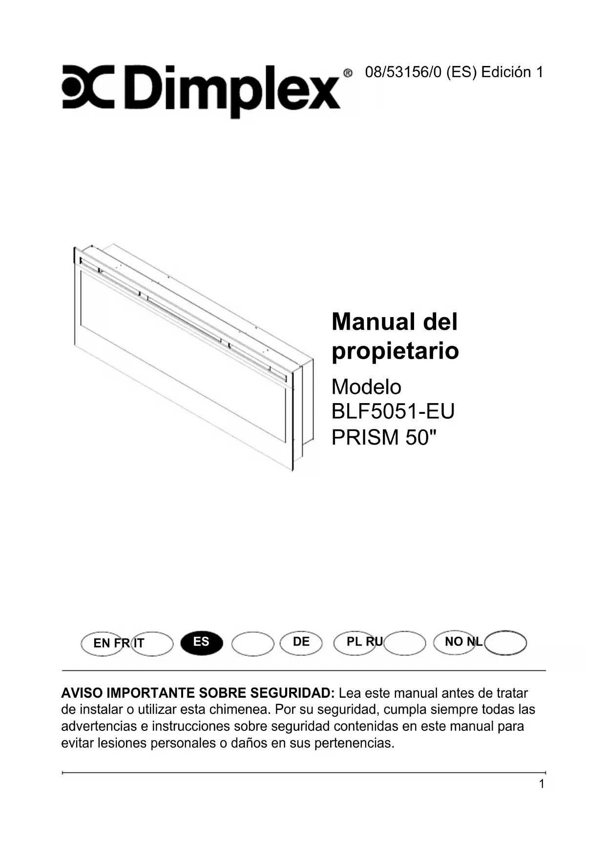 Es necesario reciclar la batería o desecharla cor- rectamente. Consulte con las autoridades locales o con un minorista para obtener información sobre el reciclaje en su área. Funcionamiento19 Mantenimiento ADVERTENCIA: Desconecte la alimentación antes de realizar ninguna tarea de mantenimiento para reducir el riesgo de incendio, descarga eléctrica o lesiones personales. Limpieza del cristal parcialmente reectante El cristal parcialmente reectante se limpia en fábrica durante el proceso de montaje. Durante el transporte, instalación, manipulado, etc., el cristal parcialmente reectante puede atraer partículas de polvo, que pueden eliminarse pasando con suavidad un paño seco y limpio. Para eliminar huellas de dedos y otras marcas, el cristal parcialmente reectante puede limpiarse con un paño seco y limpio. El cristal parcialmente reectante deberá secarse por completo con un paño que no suelte hilas para evitar manchas de agua. Paraevitarrayones, no utilice limpiadores abrasivos. Limpieza de supercies de la chimenea Utilice solo un paño humedecido para limpiar las supercies pintadas de la chimenea. No utilice limpiadores abrasivos. Servicio Salvo para las tareas de instalación y limpieza descritas en este manual, estas tareas de servicio deberán ser realizadas por un representante autorizadode servicio.Manuale dell‘utente Modello BLF5051-EU PRISM 50" INFORMAZIONI IMPORTANTI SULLA SICUREZZA: Leggere sempre questo manuale prima di tentare l‘installazione o l‘utilizzo del caminetto. Per la sicurezza, rispettare sempre tutte le AVVERTENZE e le istruzioni di sicurezza contenute nel presente manuale per prevenire lesioni personali e danni alla proprietà. 08/53156/0 (IT) 1a edizione EN FR IT ES DE PL RU NL NO2 Sommario Rivolgersi sempre a un technico qualicato o a un centro di assistenza per la riparazione considerate di questo caminetto.