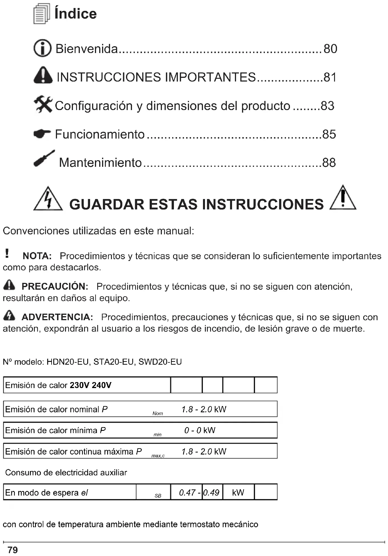 - Mantenimiento Nº modelo: HDN20-EU, STA20-EU, SWD20-EU Emisión de calor 230V 240V Emisión de calor nominal P Nom p. 88
