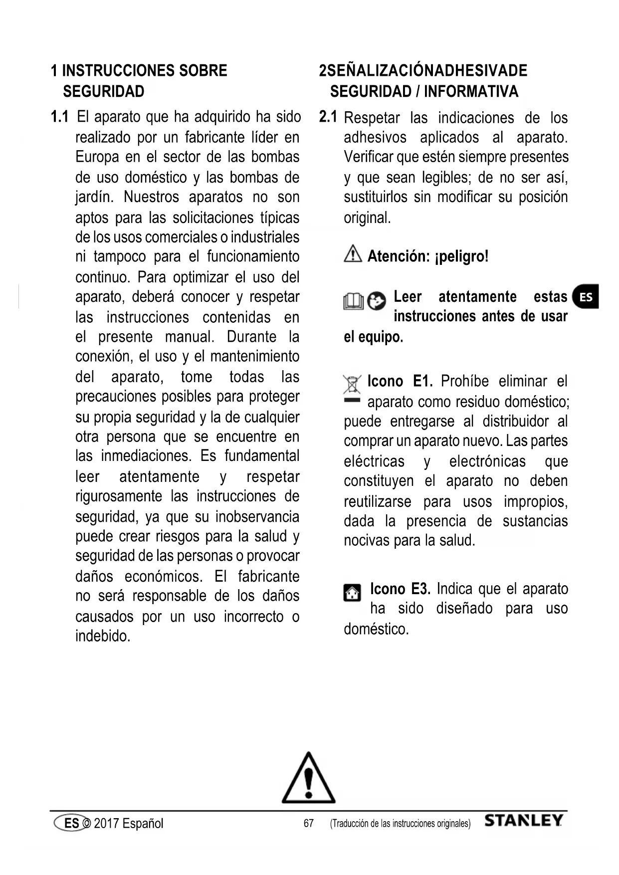 Respetar las indicaciones de los adhesivos aplicados al aparato. Verificar que estén siempre presentes y que sean legibles; de no ser así, sustituirlos sin modificar su posición original. Atención: ¡peligro! Leer atentamente estas instrucciones antes de usar el equipo. Icono E1. Prohíbe eliminar el aparato como residuo doméstico; puede entregarse al distribuidor al comprar un aparato nuevo. Las partes eléctricas y electrónicas que constituyen el aparato no deben reutilizarse para usos impropios, dada la presencia de sustancias nocivas para la salud. Icono E3. Indica que el aparato ha sido diseñado para uso doméstico.68 (Traducción de las instrucciones originales) ES © 2017 Español