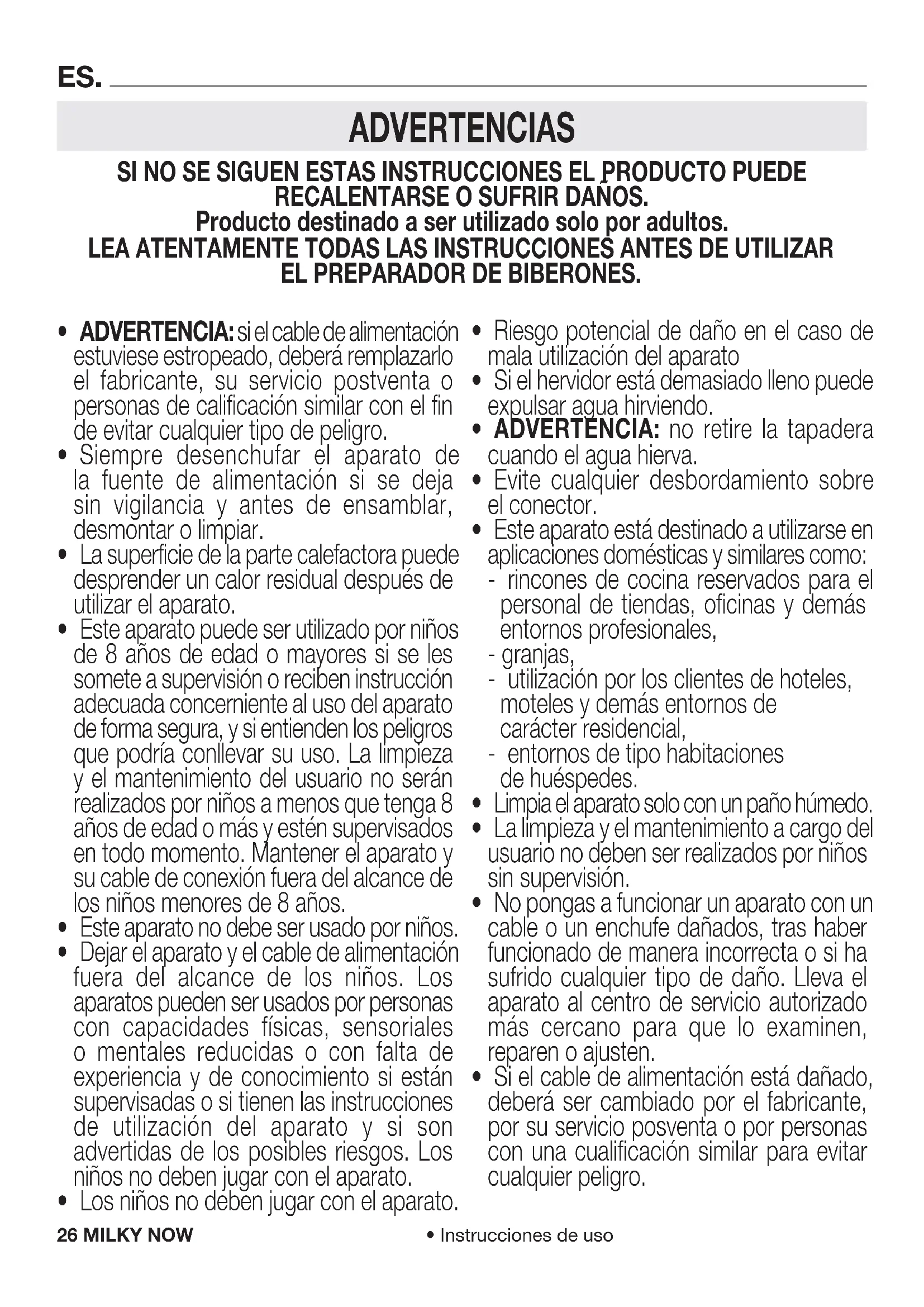 - Si el cable de alimentación está dañado, deberá ser cambiado por el fabricante, por su servicio posventa o por personas con una cualificación similar para evitar cualquier peligro.27MILKY NOW