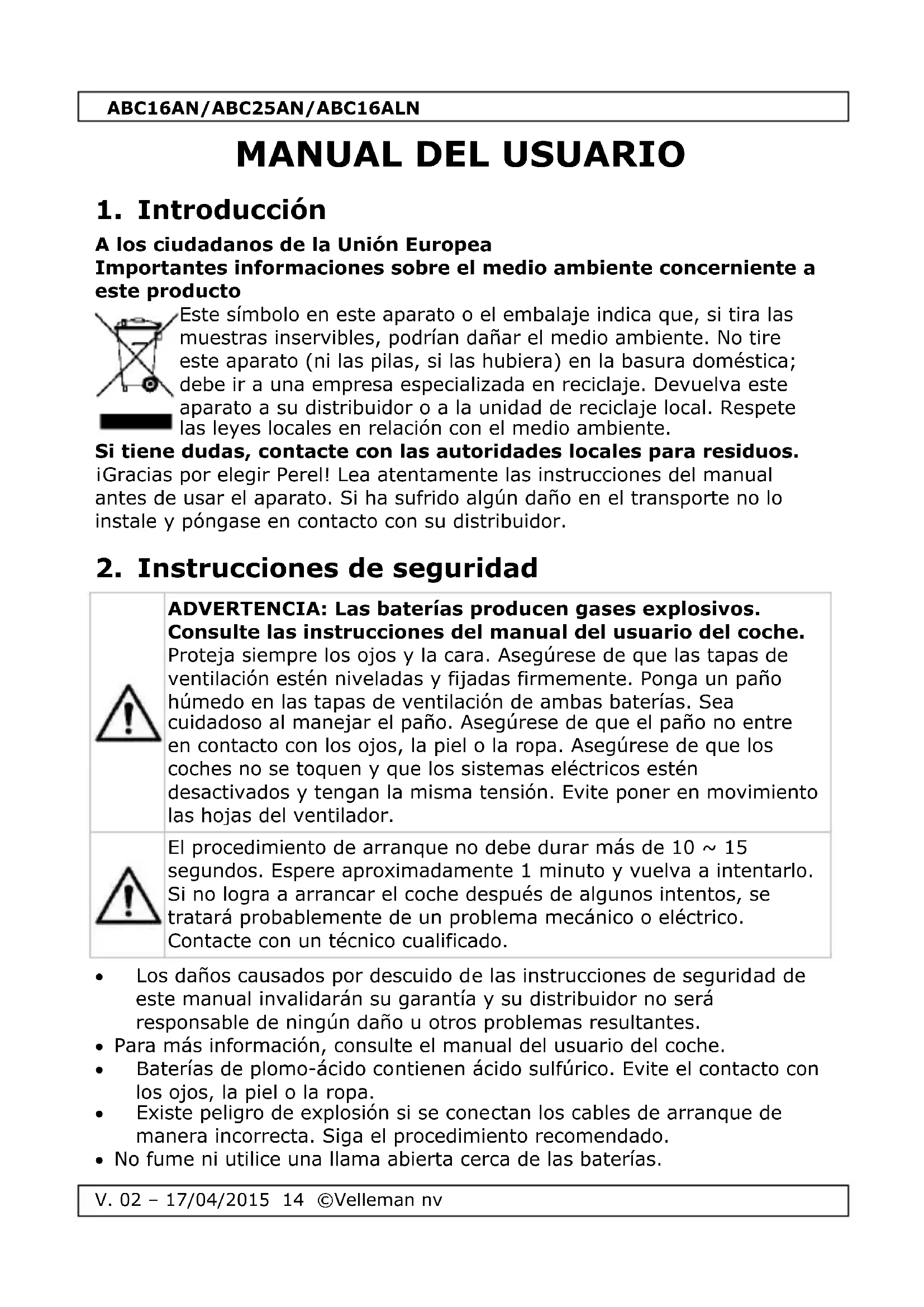 Los daños causados por descuido de las instrucciones de seguridad de este manual invalidarán su garantía y su distribuidor no será responsable de ningún daño u otros problemas resultantes. Para más información, consulte el manual del usuario del coche. Baterías de plomo-ácido contienen ácido sulfúrico. Evite el contacto con los ojos, la piel o la ropa. Existe peligro de explosión si se conectan los cables de arranque de manera incorrecta. Siga el procedimiento recomendado. No fume ni utilice una llama abierta cerca de las baterías.ABC16AN/ABC25AN/ABC16ALN