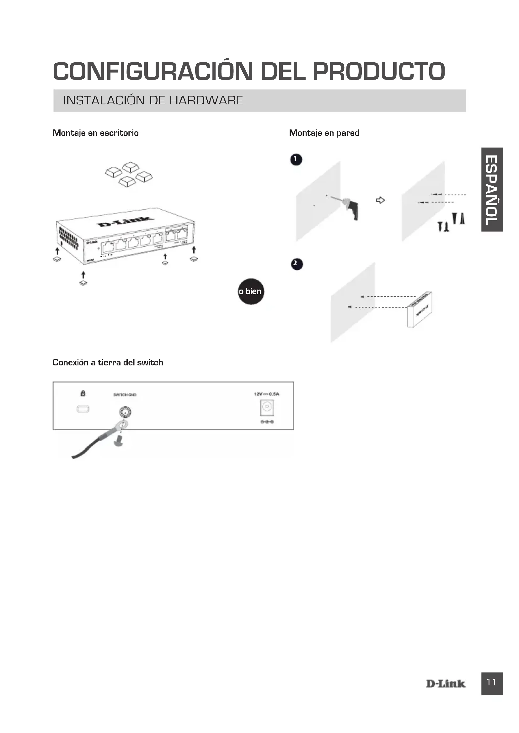 Montaje en escritorio Conexión a tierra del switch Montaje en pared