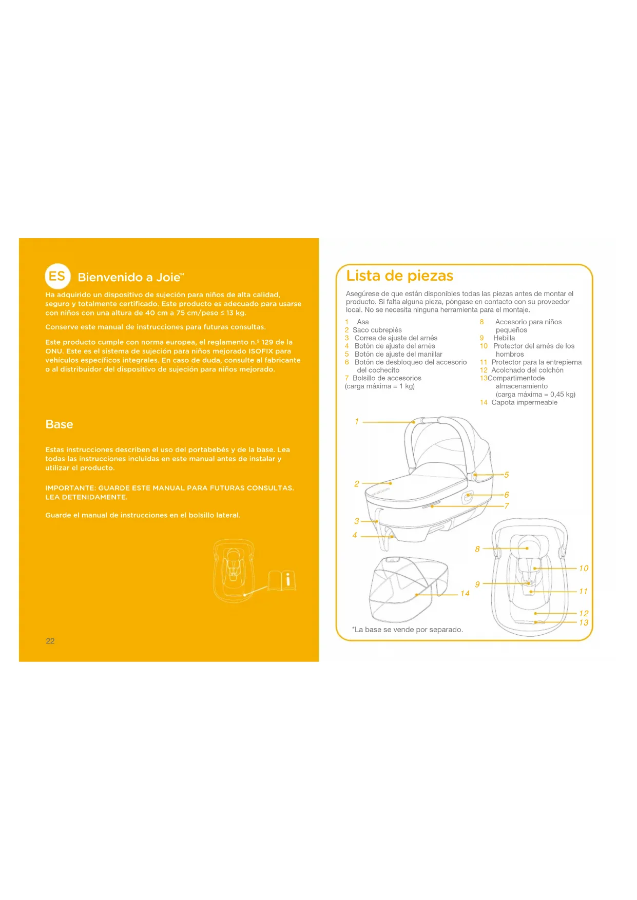 Ha adquirido un dispositivo de sujeción para niños de alta calidad, seguro y totalmente certificado. Este producto es adecuado para usarse con niños con una altura de 40cm a 75cm/peso ≤ 13 kg.Conserve este manual de instrucciones para futuras consultas.Este producto cumple con norma europea, el reglamento n.º 129 de la ONU. Este es el sistema de sujeción para niños mejorado ISOFIX para vehículos específicos integrales. En caso de duda, consulte al fabricante o al distribuidor del dispositivo de sujeción para niños mejorado. Base Estas instrucciones describen el uso del portabebés y de la base. Lea todas las instrucciones incluidas en este manual antes de instalar y utilizar el producto.IMPORTANTE: GUARDE ESTE MANUAL PARA FUTURAS CONSULTAS.LEA DETENIDAMENTE.Guarde el manual de instrucciones en el bolsillo lateral.Asegúrese de que están disponibles todas las piezas antes de montar el producto. Si falta alguna pieza, póngase en contacto con su proveedor local. No se necesita ninguna herramienta para el montaje. 1 Asa 2 Saco cubrepiés 3 Correa de ajuste del arnés 4 Botón de ajuste del arnés 5 Botón de ajuste del manillar 6 Botón de desbloqueo del accesorio del cochecito 7 Bolsillo de accesorios (carga máxima = 1kg) Lista de piezas 8 Accesorio para niños pequeños9 Hebilla10 Protector del arnés de los hombros11 Protector para la entrepierna12 Acolchado del colchón13 Compartimento de almacenamiento (carga máxima = 0,45kg)14 Capota impermeable
