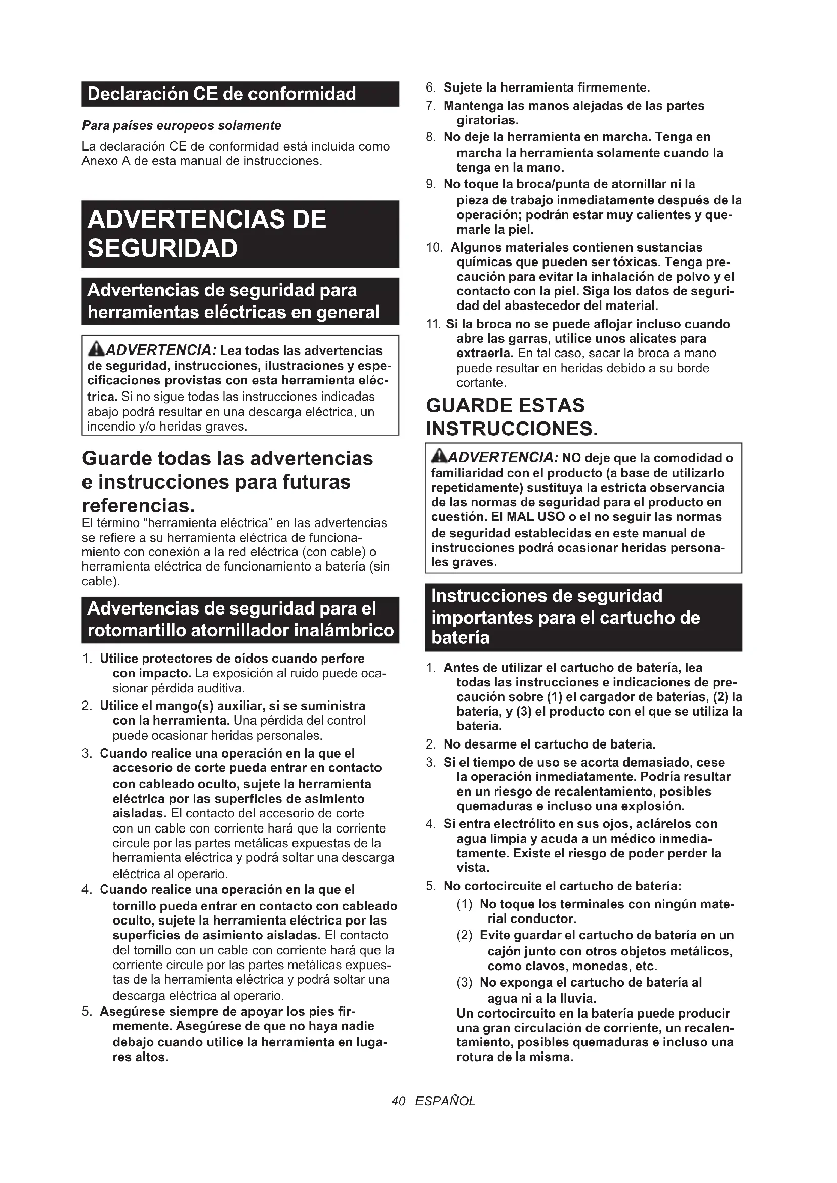 cortante. GUARDE ESTAS INSTRUCCIONES. ADVERTENCIA: NO deje que la comodidad o familiaridad con el producto (a base de utilizarlo repetidamente) sustituya la estricta observancia de las normas de seguridad para el producto en cuestión. El MAL USO o el no seguir las normas de seguridad establecidas en este manual de instrucciones podrá ocasionar heridas persona- les graves. Instrucciones de seguridad importantes para el cartucho de batería
