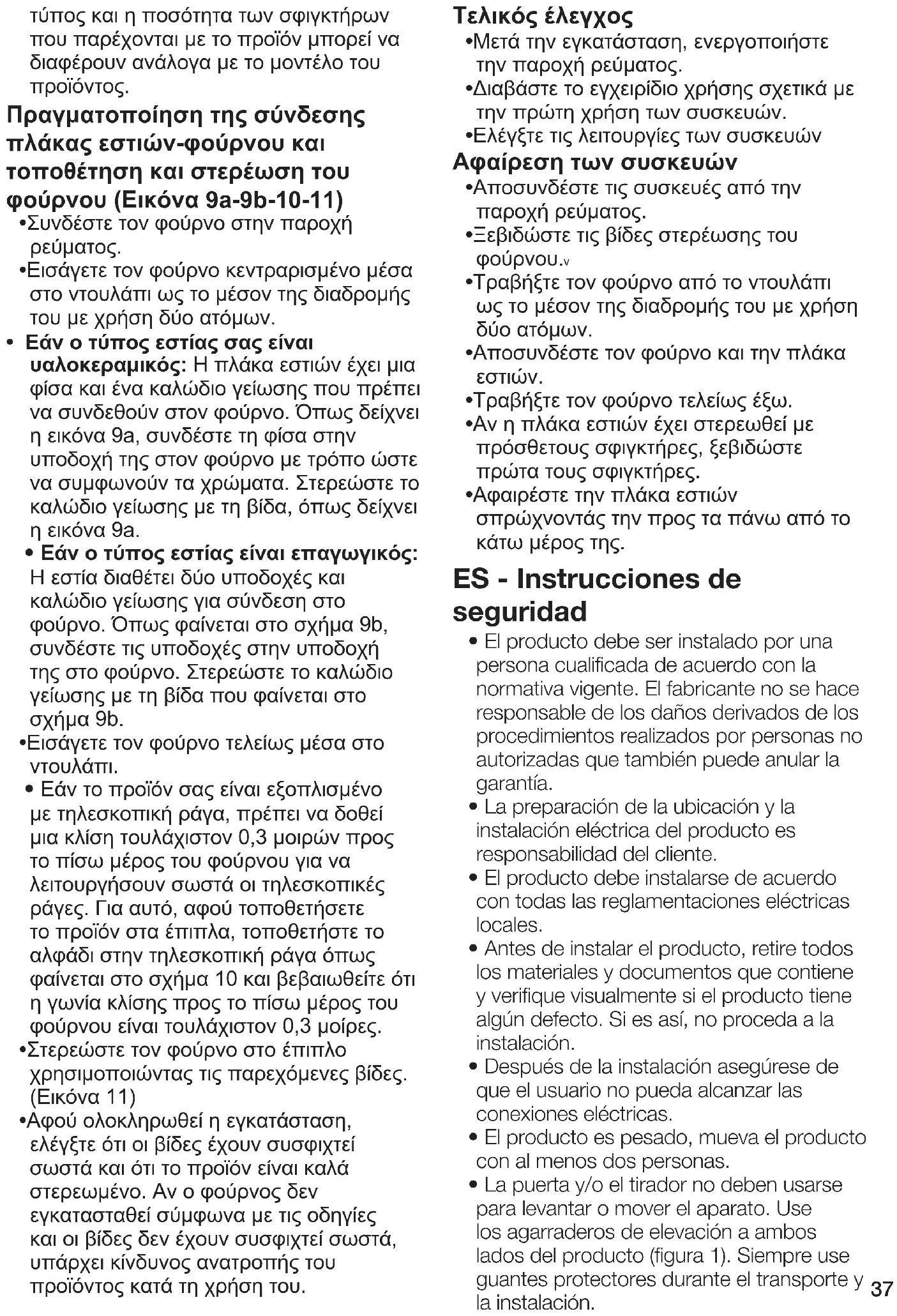 - La puerta y/o el tirador no deben usarse para levantar o mover el aparato. Use los agarraderos de elevación a ambos lados del producto (figura 1). Siempre use guantes protectores durante el transporte y la instalación.38