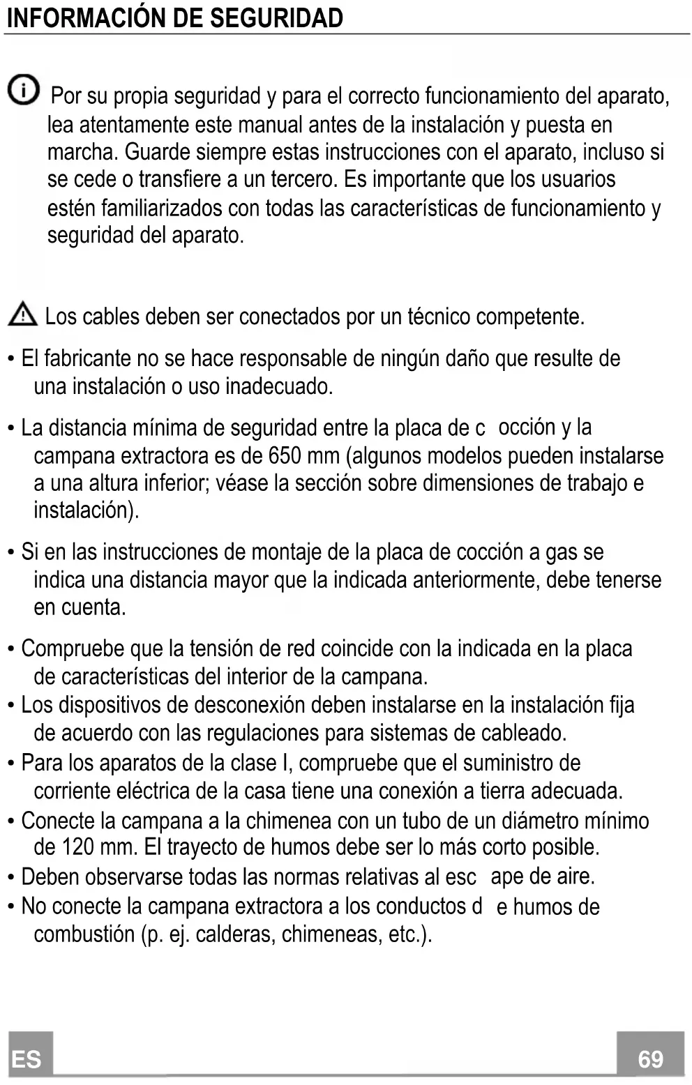 - No conecte la campana extractora a los conductos d e humos de combustión (p. ej. calderas, chimeneas, etc.).ES