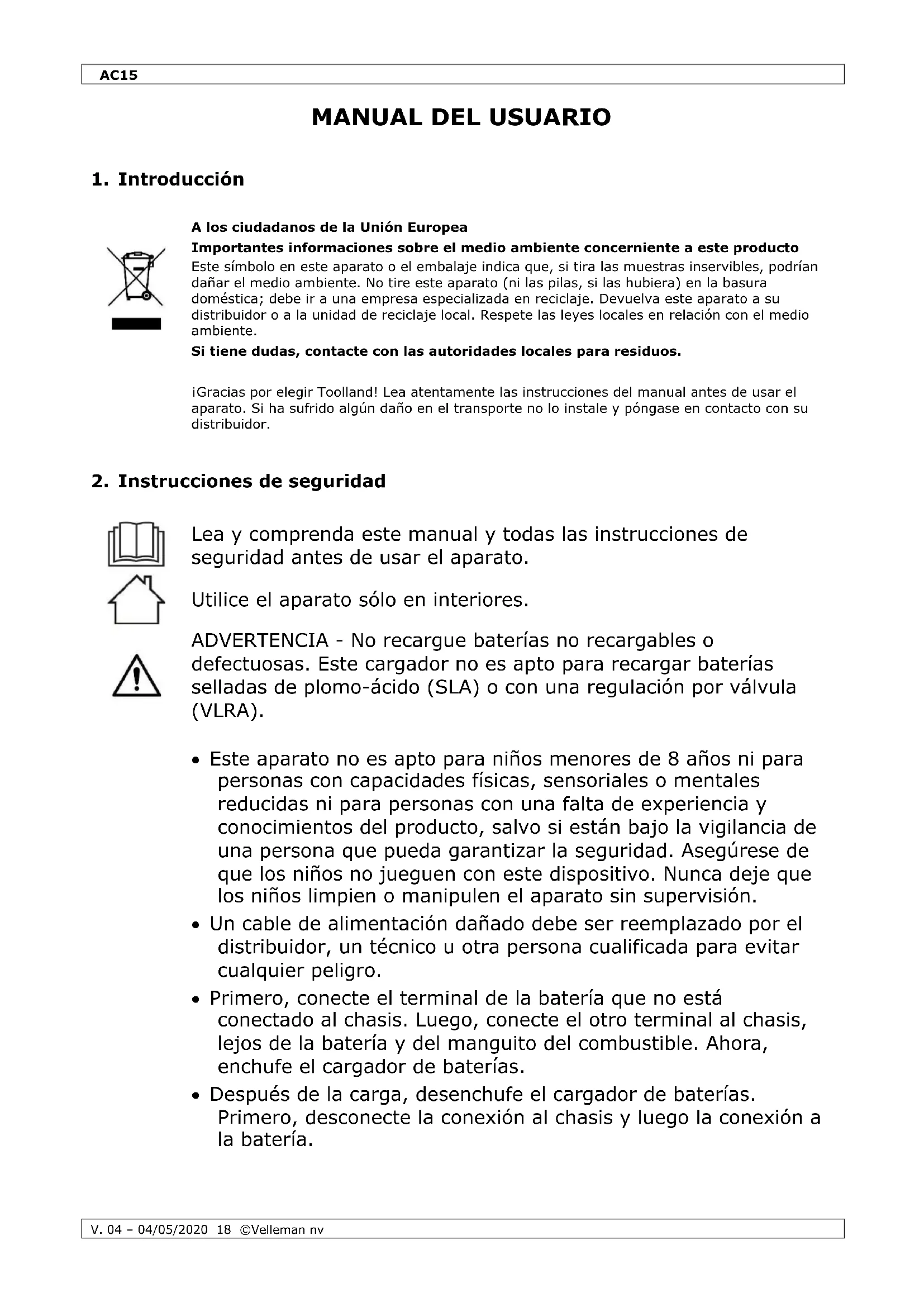 Velleman NV dispone de los derechos de autor para este manual del usuario. Todos los derechos mundiales reservados. Está estrictamente prohibido reproducir, traducir, copiar, editar y guardar este manual del usuario o partes de ello sin el consentimiento previo por escrito del propietario del copyright.AC15