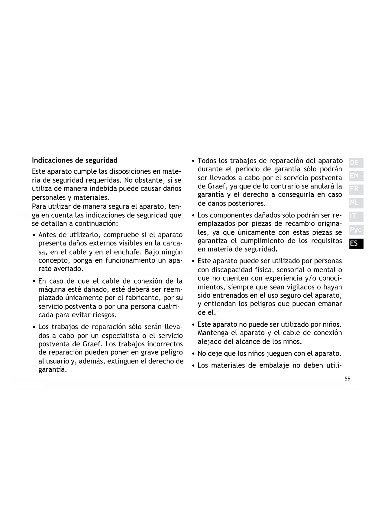 - Todos los trabajos de reparación del aparato durante el período de garantía sólo podrán ser llevados a cabo por el servicio postventa de Graef, ya que de lo contrario se anulará la garantía y el derecho a conseguirla en caso de daños posteriores.