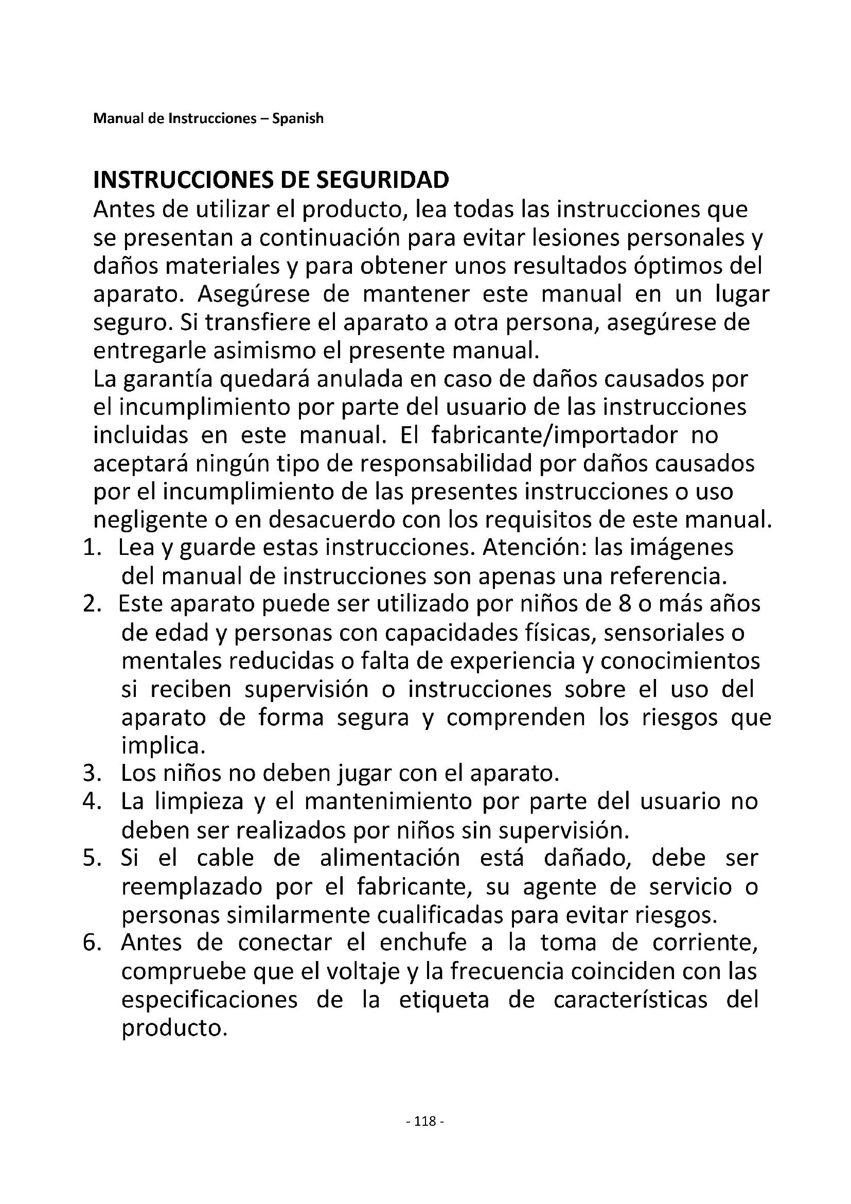 Antes de utilizar el producto, lea todas las instrucciones que se presentan a continuación para evitar lesiones personales y daños materiales y para obtener unos resultados óptimos del aparato. Asegúrese de mantener este manual en un lugar seguro. Si transfiere el aparato a otra persona, asegúrese de entregarle asimismo el presente manual. La garantía quedará anulada en caso de daños causados por el incumplimiento por parte del usuario de las instrucciones incluidas en este manual. El fabricante/importador no aceptará ningún tipo de responsabilidad por daños causados por el incumplimiento de las presentes instrucciones o uso negligente o en desacuerdo con los requisitos de este manual.