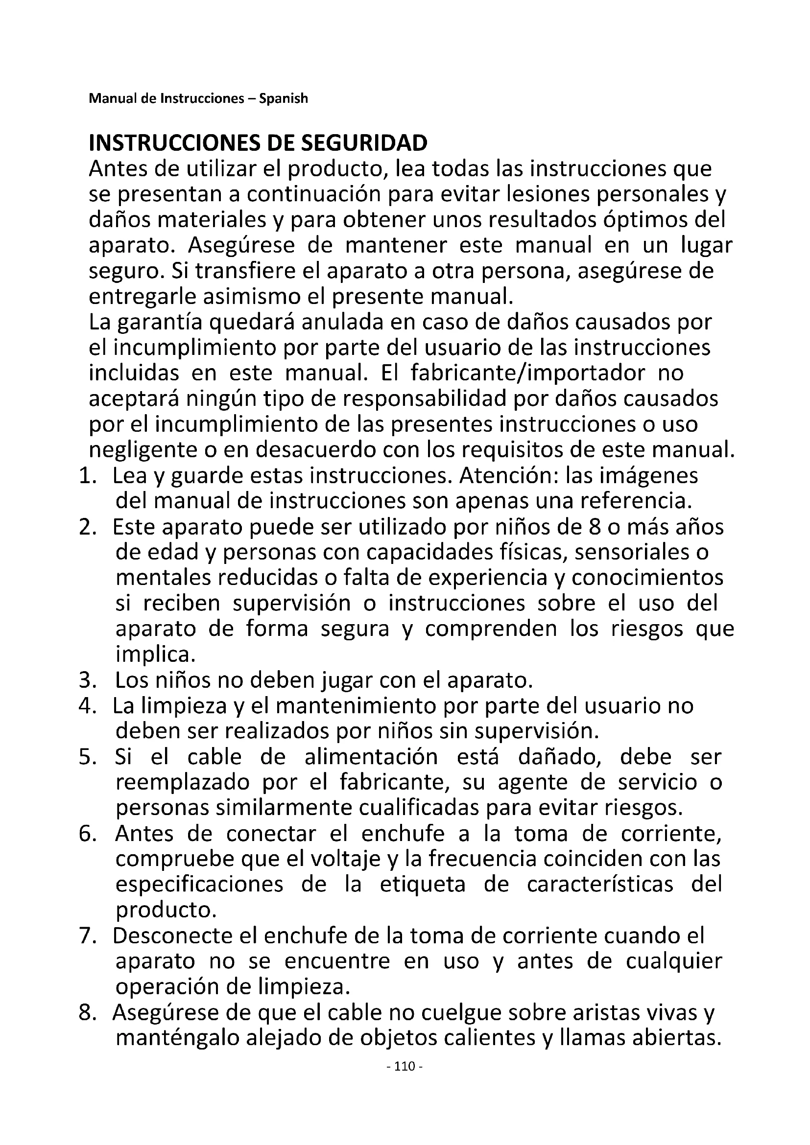 Antes de utilizar el producto, lea todas las instrucciones que se presentan a continuación para evitar lesiones personales y daños materiales y para obtener unos resultados óptimos del aparato. Asegúrese de mantener este manual en un lugar seguro. Si transfiere el aparato a otra persona, asegúrese de entregarle asimismo el presente manual. La garantía quedará anulada en caso de daños causados por el incumplimiento por parte del usuario de las instrucciones incluidas en este manual. El fabricante/importador no aceptará ningún tipo de responsabilidad por daños causados por el incumplimiento de las presentes instrucciones o uso negligente o en desacuerdo con los requisitos de este manual.
