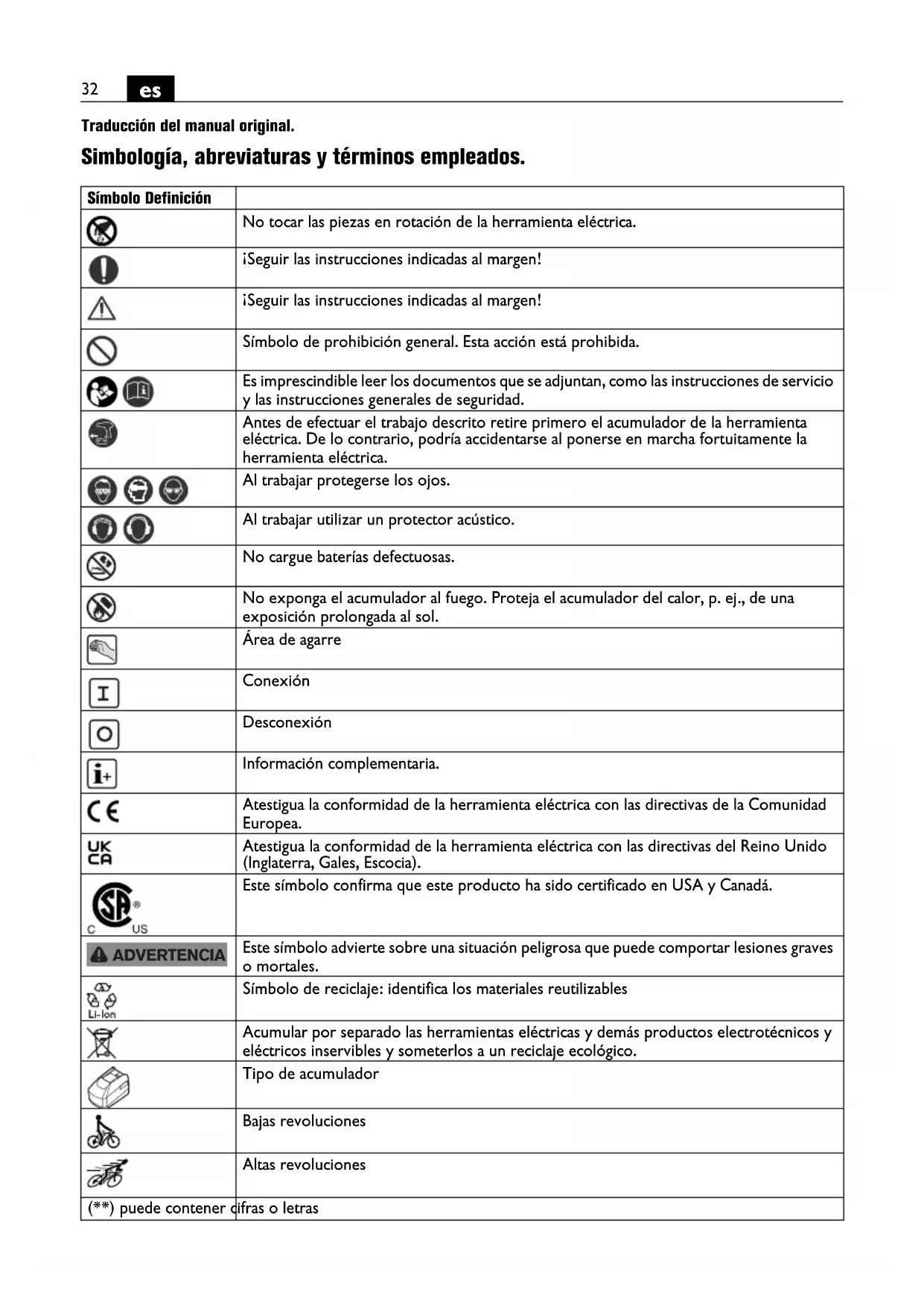 Traducción del manual original. Simbología, abreviaturas y términos empleados. Símbolo Definición No tocar las piezas en rotación de la herramienta eléctrica. ¡Seguir las instrucciones indicadas al margen! ¡Seguir las instrucciones indicadas al margen! Símbolo de prohibición general. Esta acción está prohibida. Es imprescindible leer los documentos que se adjuntan, como las instrucciones de servicio y las instrucciones generales de seguridad. Antes de efectuar el trabajo descrito retire primero el acumulador de la herramienta eléctrica. De lo contrario, podría accidentarse al ponerse en marcha fortuitamente la herramienta eléctrica. Al trabajar protegerse los ojos. Al trabajar utilizar un protector acústico. No cargue baterías defectuosas. No exponga el acumulador al fuego. Proteja el acumulador del calor, p. ej., de una exposición prolongada al sol. Área de agarre Conexión Desconexión Información complementaria. Atestigua la conformidad de la herramienta eléctrica con las directivas de la Comunidad Europea. Atestigua la conformidad de la herramienta eléctrica con las directivas del Reino Unido (Inglaterra, Gales, Escocia). Este símbolo confirma que este producto ha sido certificado en USA y Canadá. Este símbolo advierte sobre una situación peligrosa que puede comportar lesiones graves o mortales. Símbolo de reciclaje: identifica los materiales reutilizables Acumular por separado las herramientas eléctricas y demás productos electrotécnicos y eléctricos inservibles y someterlos a un reciclaje ecológico. Tipo de acumulador Bajas revoluciones Altas revoluciones (**) puede contener cifras o letras ADVERTENCIA33