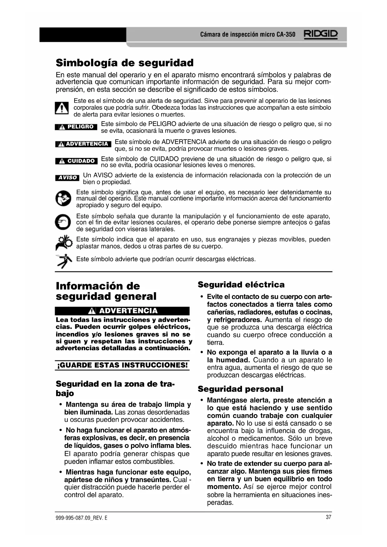 - El servicio de este equipo debe en- comendarse a técnicos calificados que empleen únicamente repuestos legíti- mos. Sólo así se garantiza la continua se- guridad de la herramienta. Información de seguridad específica ADVERTENCIA Esta sección entrega información de se-guridad específica para esta cámara de inspección. Antes de utilizar la Cámara de inspec-ción micro CA-350 de RIDGID , lea estas instrucciones detenidamente para pre-venir choques eléctricos y otras lesiones de gravedad. ¡GUARDE ESTAS INSTRUCCIONES! El maletín de la Cámara de inspección micro CA-350 cuenta con un compartimiento es- pecial para conservar este manual al alcance del operario.