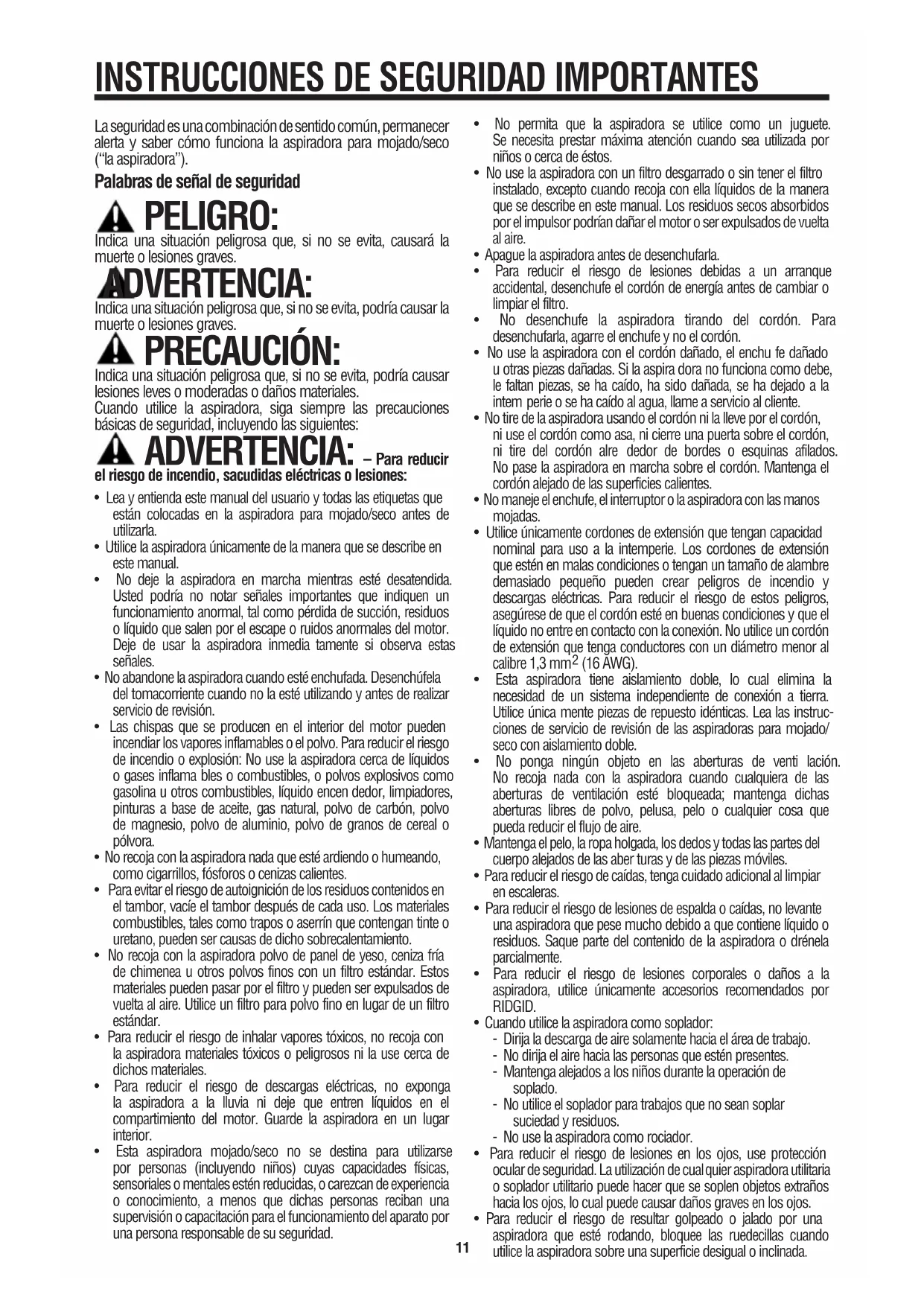 La seguridad es una combinación de sentido común, permanecer alerta y saber cómo funciona la aspiradora para mojado/seco (“la aspiradora”). Palabras de señal de seguridad PELIGRO: Indica una situación peligrosa que, si no se evita, causará la muerte o lesiones graves. ADVERTENCIA: Indica una situación peligrosa que, si no se evita, podría causar la muerte o lesiones graves. PRECAUCIÓN: Indica una situación peligrosa que, si no se evita, podría causar lesiones leves o moderadas o daños materiales. Cuando utilice la aspiradora, siga siempre las precauciones básicas de seguridad, incluyendo las siguientes: ADVERTENCIA: – Para reducir el riesgo de incendio, sacudidas eléctricas o lesiones: