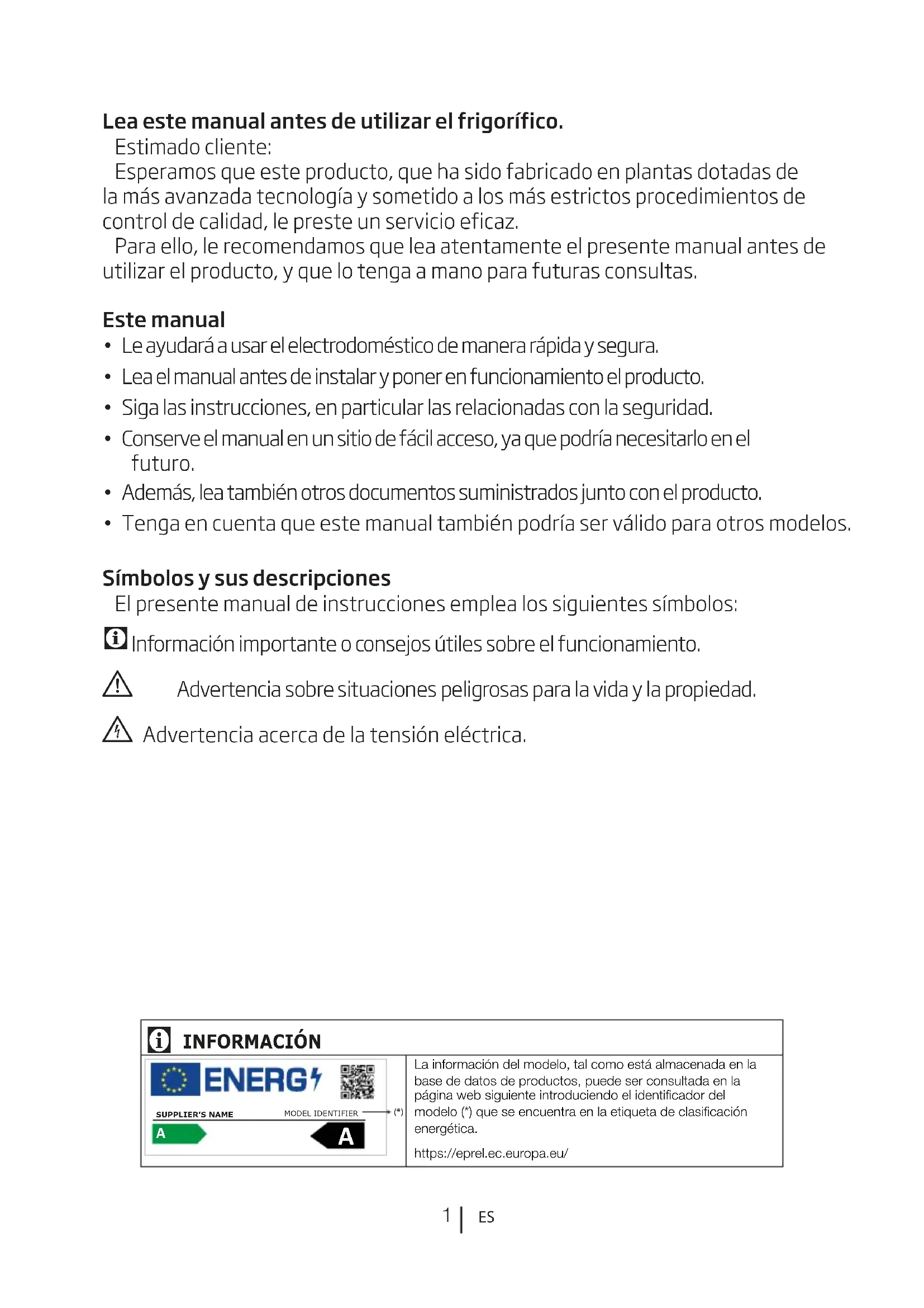 Lea este manual antes de utilizar el frigorífico. Estimado cliente: Esperamos que este producto, que ha sido fabricado en plantas dotadas de la más avanzada tecnología y sometido a los más estrictos procedimientos de control de calidad, le preste un servicio eficaz. Para ello, le recomendamos que lea atentamente el presente manual antes de utilizar el producto, y que lo tenga a mano para futuras consultas. Este manual