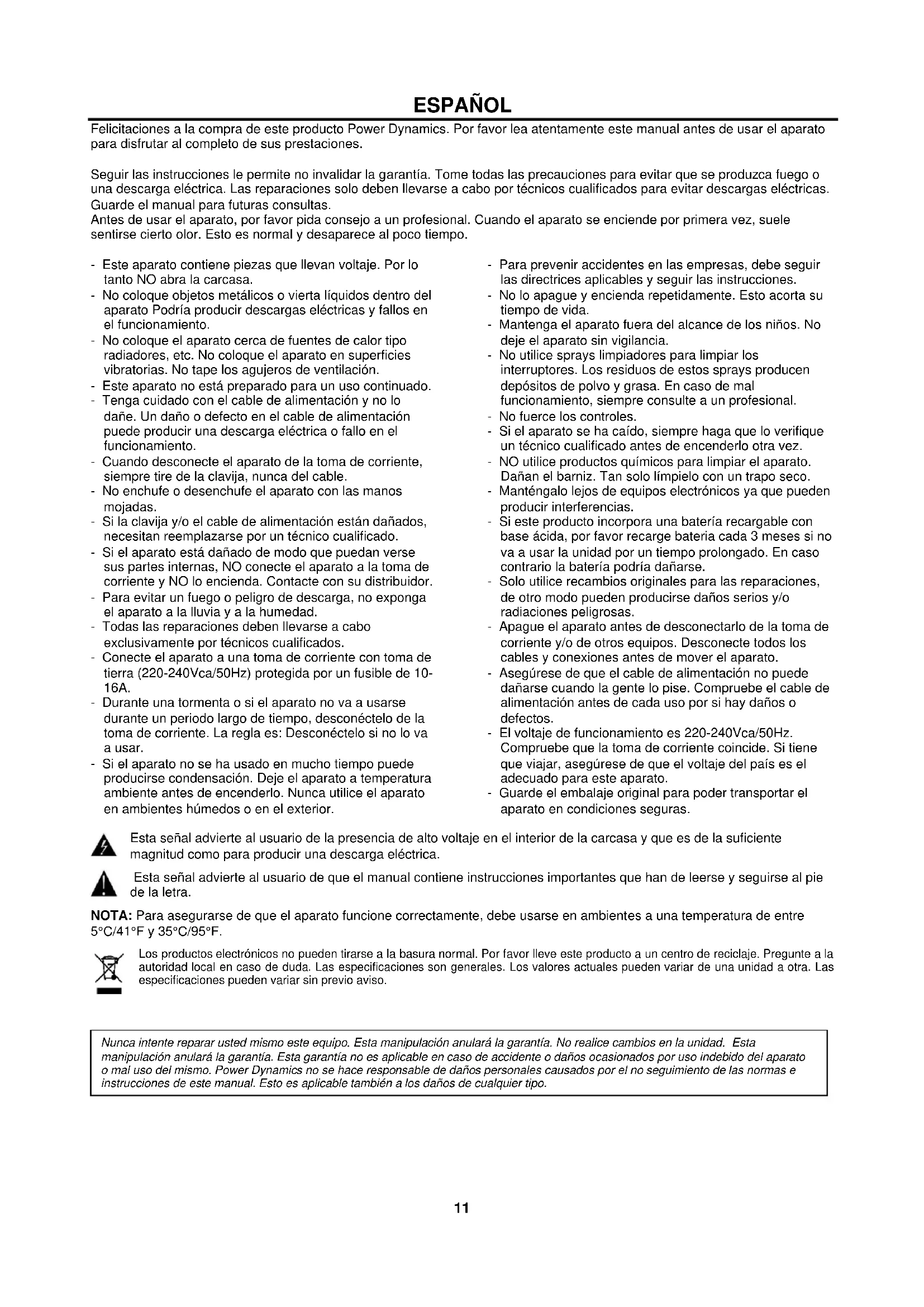Wenn Sie nach einem Passwort gefragt werden, geben Sie "0000" ein. Hinweis: Das BT hat eine Reichweite von etwa 10 Metern ohne jede Barriere.11 ESPAÑOL Felicitaciones a la compra de este producto Power Dynamics. Por favor lea atentamente este manual antes de usar el aparato para disfrutar al completo de sus prestaciones. Seguir las instrucciones le permite no invalidar la garantía. Tome todas las precauciones para evitar que se produzca fuego o una descarga eléctrica. Las reparaciones solo deben llevarse a cabo por técnicos cualificados para evitar descargas eléctricas. Guarde el manual para futuras consultas. Antes de usar el aparato, por favor pida consejo a un profesional. Cuando el aparato se enciende por primera vez, suele sentirse cierto olor. Esto es normal y desaparece al poco tiempo. - Este aparato contiene piezas que llevan voltaje. Por lo tanto NO abra la carcasa. - No coloque objetos metálicos o vierta líquidos dentro del aparato Podría producir descargas eléctricas y fallos en el funcionamiento. - No coloque el aparato cerca de fuentes de calor tipo radiadores, etc. No coloque el aparato en superficies vibratorias. No tape los agujeros de ventilación. - Este aparato no está preparado para un uso continuado. - Tenga cuidado con el cable de alimentación y no lo dañe. Un daño o defecto en el cable de alimentación puede producir una descarga eléctrica o fallo en el funcionamiento. - Cuando desconecte el aparato de la toma de corriente, siempre tire de la clavija, nunca del cable. - No enchufe o desenchufe el aparato con las manos mojadas. - Si la clavija y/o el cable de alimentación están dañados, necesitan reemplazarse por un técnico cualificado. - Si el aparato está dañado de modo que puedan verse sus partes internas, NO conecte el aparato a la toma de corriente y NO lo encienda. Contacte con su distribuidor. - Para evitar un fuego o peligro de descarga, no exponga el aparato a la lluvia y a la humedad. - Todas las reparaciones deben llevarse a cabo exclusivamente por técnicos cualificados. - Conecte el aparato a una toma de corriente con toma de tierra (220-240Vca/50Hz) protegida por un fusible de 10- 16A. - Durante una tormenta o si el aparato no va a usarse durante un periodo largo de tiempo, desconéctelo de la toma de corriente. La regla es: Desconéctelo si no lo va a usar. - Si el aparato no se ha usado en mucho tiempo puede producirse condensación. Deje el aparato a temperatura ambiente antes de encenderlo. Nunca utilice el aparato en ambientes húmedos o en el exterior. - Para prevenir accidentes en las empresas, debe seguir las directrices aplicables y seguir las instrucciones. - No lo apague y encienda repetidamente. Esto acorta su tiempo de vida. - Mantenga el aparato fuera del alcance de los niños. No deje el aparato sin vigilancia. - No utilice sprays limpiadores para limpiar los interruptores. Los residuos de estos sprays producen depósitos de polvo y grasa. En caso de mal funcionamiento, siempre consulte a un profesional. - No fuerce los controles. - Si el aparato se ha caído, siempre haga que lo verifique un técnico cualificado antes de encenderlo otra vez. - NO utilice productos químicos para limpiar el aparato. Dañan el barniz. Tan solo límpielo con un trapo seco. - Manténgalo lejos de equipos electrónicos ya que pueden producir interferencias. - Si este producto incorpora una batería recargable con base ácida, por favor recarge bateria cada 3 meses si no va a usar la unidad por un tiempo prolongado. En caso contrario la batería podría dañarse. - Solo utilice recambios originales para las reparaciones, de otro modo pueden producirse daños serios y/o radiaciones peligrosas. - Apague el aparato antes de desconectarlo de la toma de corriente y/o de otros equipos. Desconecte todos los cables y conexiones antes de mover el aparato. - Asegúrese de que el cable de alimentación no puede dañarse cuando la gente lo pise. Compruebe el cable de alimentación antes de cada uso por si hay daños o defectos. - El voltaje de funcionamiento es 220-240Vca/50Hz. Compruebe que la toma de corriente coincide. Si tiene que viajar, asegúrese de que el voltaje del país es el adecuado para este aparato. - Guarde el embalaje original para poder transportar el aparato en condiciones seguras. Esta señal advierte al usuario de la presencia de alto voltaje en el interior de la carcasa y que es de la suficiente magnitud como para producir una descarga eléctrica. Esta señal advierte al usuario de que el manual contiene instrucciones importantes que han de leerse y seguirse al pie de la letra. NOTA: Para asegurarse de que el aparato funcione correctamente, debe usarse en ambientes a una temperatura de entre 5°C/41°F y 35°C/95°F. Los productos electrónicos no pueden tirarse a la basura normal. Por favor lleve este producto a un centro de reciclaje. Pregunte a la autoridad local en caso de duda. Las especificaciones son generales. Los valores actuales pueden variar de una unidad a otra. Las especificaciones pueden variar sin previo aviso.