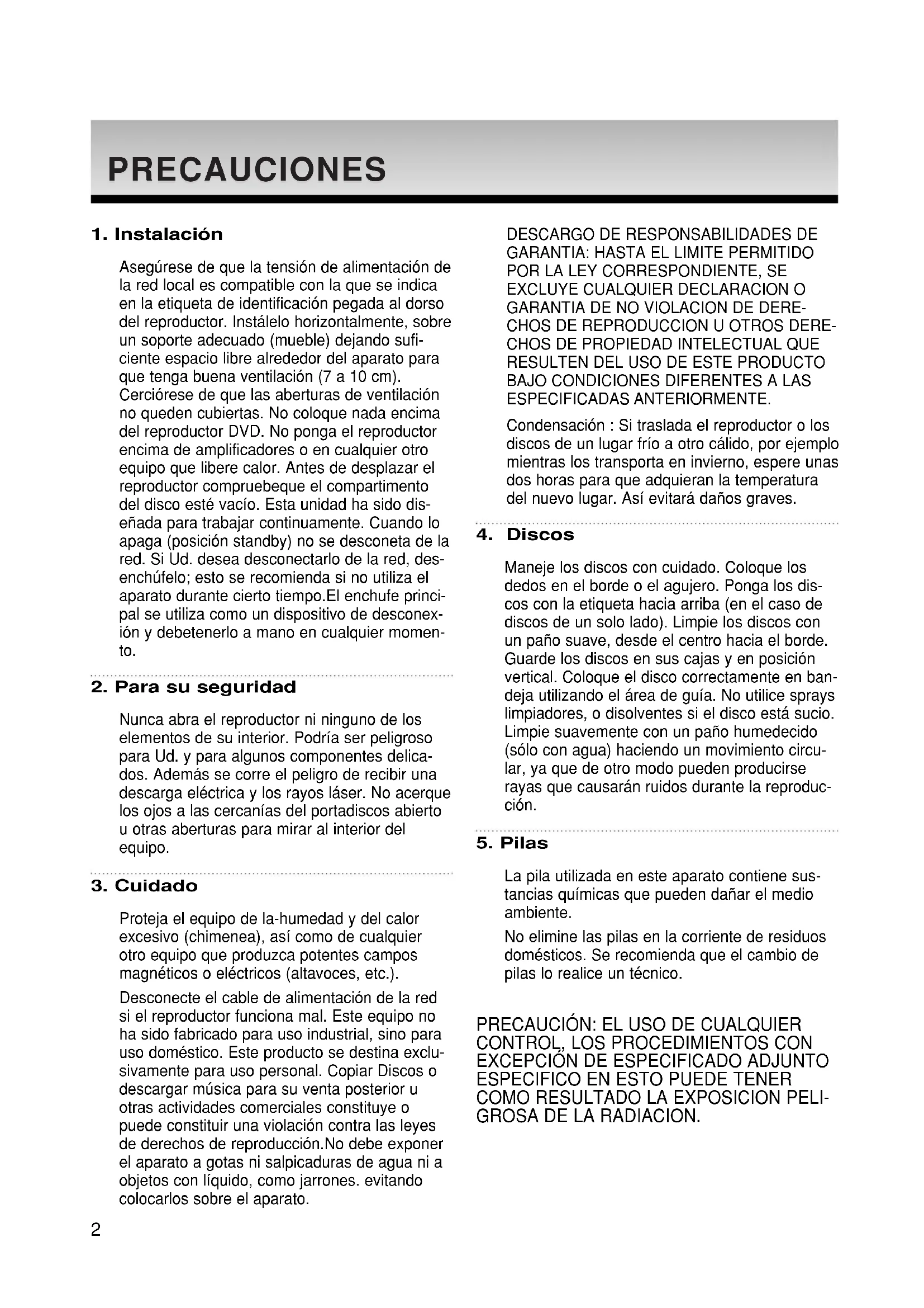 Nunca abra el reproductor ni ninguno de los elementos de su interior. Podría ser peligroso para Ud. y para algunos componentes delica- dos. Además se corre el peligro de recibir una descarga eléctrica y los rayos láser. No acerque los ojos a las cercanías del portadiscos abierto u otras aberturas para mirar al interior del equipo.
