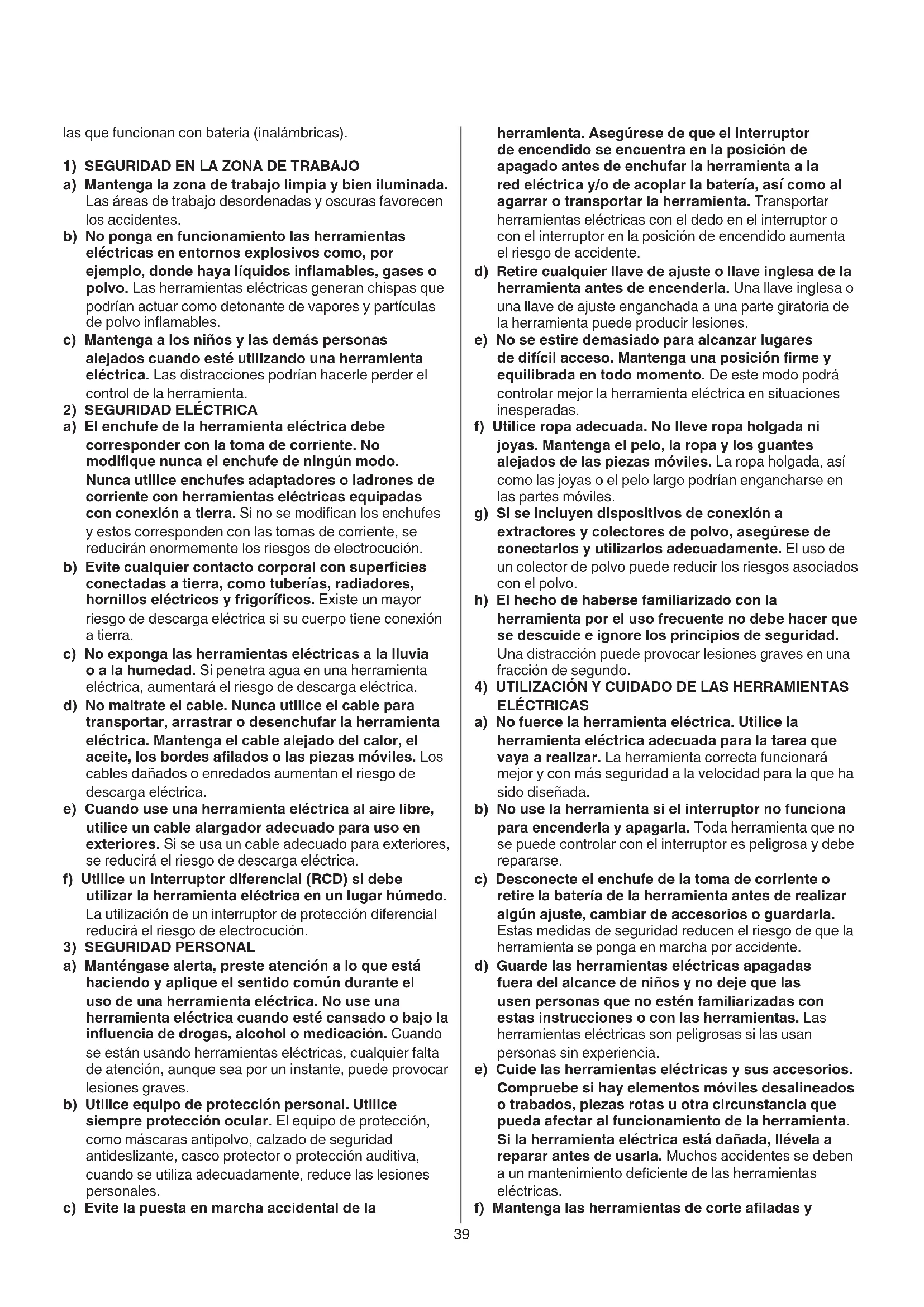 a) Mantenga la zona de trabajo limpia y bien iluminada. Las áreas de trabajo desordenadas y oscuras favorecen los accidentes. b) No ponga en funcionamiento las herramientas eléctricas en entornos explosivos como, por ejemplo, donde haya líquidos inamables, gases o polvo. Las herramientas eléctricas generan chispas que podrían actuar como detonante de vapores y partículas de polvo inamables. c) Mantenga a los niños y las demás personas alejados cuando esté utilizando una herramienta eléctrica. Las distracciones podrían hacerle perder el control de la herramienta.