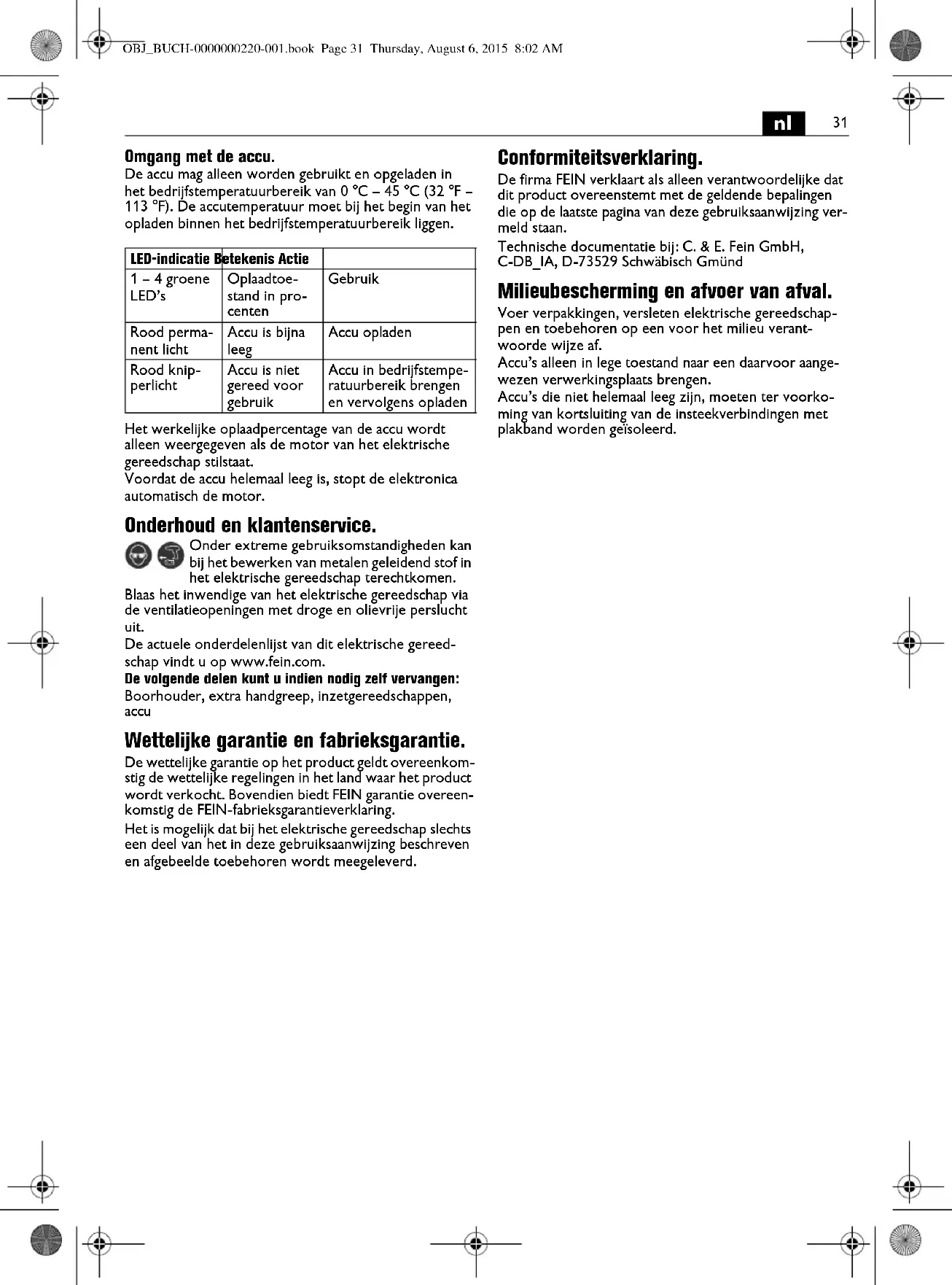 Trato del acumulador. Únicamente utilice y cargue el acumulador si su tempera- tura se encuentra dentro del margen de operación de 0 °C – 45 °C (32 °F – 113 °F). Al comenzar a cargar el acu- mulador su temperatura deberá estar dentro del margen especificado para su operación. El porcentaje del estado de carga real del acumulador solamente se indica estando detenido el motor de la herramienta eléctrica. Antes de que el acumulador llegue a descargarse excesi- vamente, el sistema electrónico desconecta el motor de forma automática. Reparación y servicio técnico. En caso de trabajar metales bajo unas condicio- nes extremas puede llegar a depositarse polvo conductor de corriente en el interior de la herramienta eléctrica. Sople con frecuencia desde afuera aire comprimido seco y exento de aceite por las rejillas de refrigeración para limpiar el interior de la herramienta eléctrica. La lista de piezas de refacción actual para esta herramienta eléctrica la encuentra en internet bajo www.fein.com. Si fuese preciso, puede sustituir Ud. mismo las piezas siguientes: Portabrocas, empuñadura adicional, útiles, acumulador Garantía. La garantía del producto se realiza de acuerdo a las regu- laciones legales vigentes en el país de adquisición. Adicio- nalmente, FEIN ofrece una garantía ampliada de acuerdo con la declaración de garantía del fabricante FEIN. El material de serie suministrado con su herramienta eléc- trica puede que no corresponda en su totalidad al mate- rial descrito o mostrado en estas instrucciones de servicio. Declaración de conformidad. La empresa FEIN declara bajo su propia responsabilidad que este producto cumple con las disposiciones pertinen- tes detalladas en la última página de estas instrucciones de servicio. Expediente técnico en: C. & E. Fein GmbH, C-DB_IA, D-73529 Schwäbisch Gmünd Protección del medio ambiente, elimina- ción. Los embalajes, y las herramientas eléctricas y accesorios inservibles deberán entregarse a los puntos de recogida correspondientes para que puedan ser sometidos a un reciclaje ecológico. Únicamente entregue acumuladores que estén descarga- dos a un punto de recogida regularizado. Si los acumuladores no estuviesen totalmente descarga- dos aisle sus contactos con cinta adhesiva para prevenir un posible cortocircuito. Indicador LED Significado Acción 1–4 LED ver- des Nivel porcen- tual de carga Operación Luz roja per- manente Acumulador casi vacío Cargar acumulador Luz roja inter- mitente El acumulador no está listo para funcionar Procure que la tem- peratura del acumu- lador se encuentre dentro del margen de operación, y cár- guelo a continuación OBJ_BUCH-0000000220-001.book Page 35 Thursday, August 6, 2015 8:02 AM36
