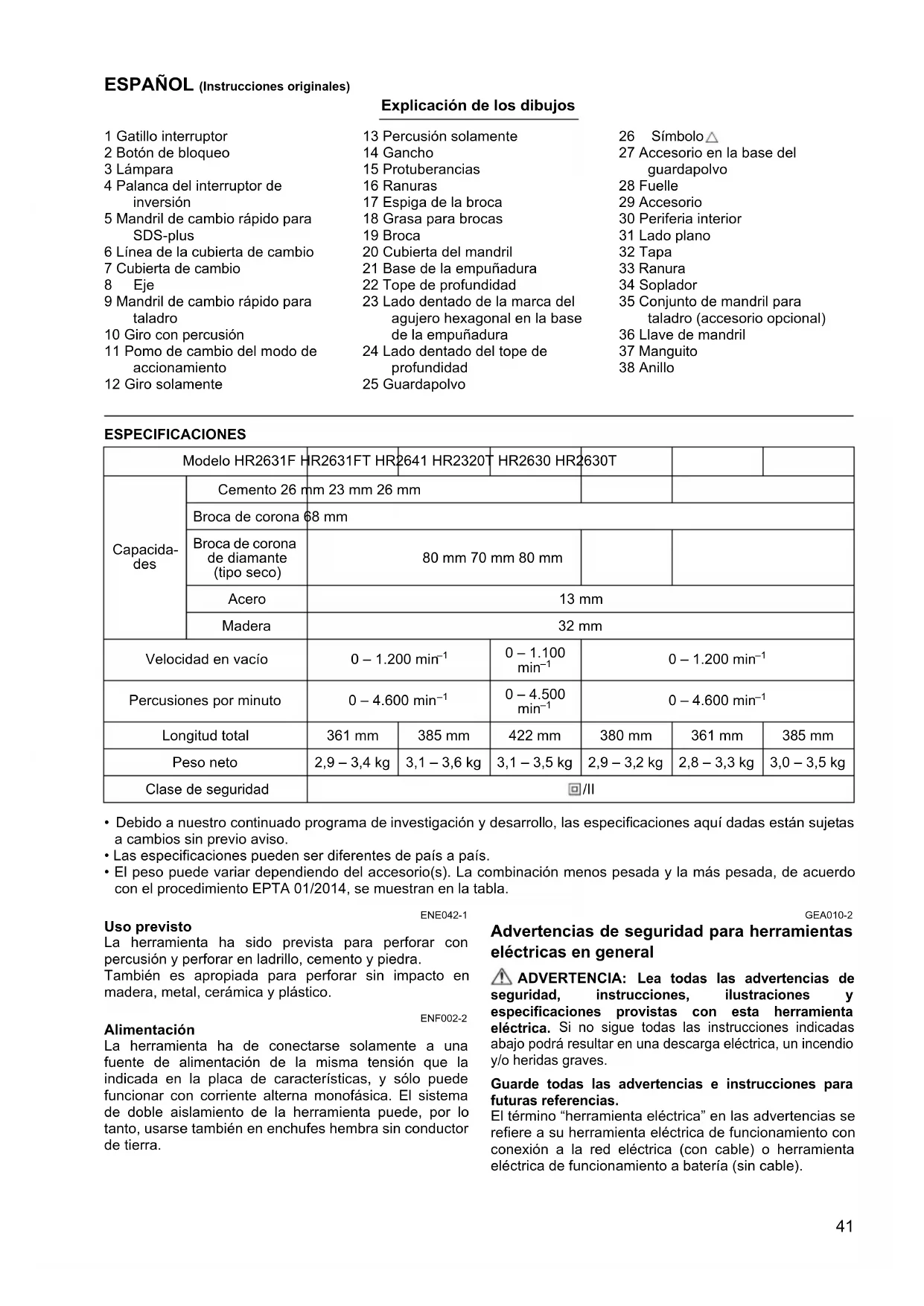 - El peso puede variar dependiendo del accesorio(s). La combinación menos pesada y la más pesada, de acuerdo con el procedimiento EPTA 01/2014, se muestran en la tabla. ENE042-1 Uso previsto La herramienta ha sido prevista para perforar con percusión y perforar en ladrillo, cemento y piedra. También es apropiada para perforar sin impacto en madera, metal, cerámica y plástico. ENF002-2 Alimentación La herramienta ha de conectarse solamente a una fuente de alimentación de la misma tensión que la indicada en la placa de características, y sólo puede funcionar con corriente alterna monofásica. El sistema de doble aislamiento de la herramienta puede, por lo tanto, usarse también en enchufes hembra sin conductor de tierra. GEA010-2 Advertencias de seguridad para herramientas eléctricas en general ADVERTENCIA: Lea todas las advertencias de seguridad, instrucciones, ilustraciones y especificaciones provistas con esta herramienta eléctrica. Si no sigue todas las instrucciones indicadas abajo podrá resultar en una descarga eléctrica, un incendio y/o heridas graves. Guarde todas las advertencias e instrucciones para futuras referencias. El término “herramienta eléctrica” en las advertencias se refiere a su herramienta eléctrica de funcionamiento con conexión a la red eléctrica (con cable) o herramienta eléctrica de funcionamiento a batería (sin cable). Modelo HR2631F HR2631FT HR2641 HR2320T HR2630 HR2630T Capacida- des Cemento 26 mm 23 mm 26 mm Broca de corona 68 mm Broca de corona de diamante (tipo seco) 80 mm 70 mm 80 mm Acero 13 mm Madera 32 mm Velocidad en vacío 0 – 1.200 min