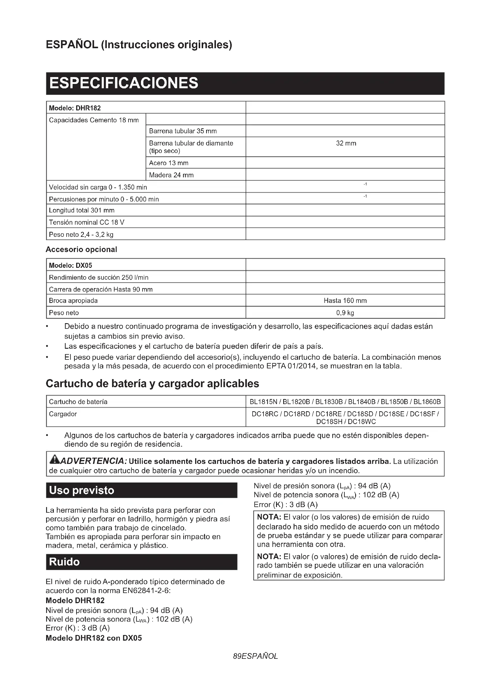 - Algunosdeloscartuchosdebateríaycargadoresindicadosarribapuedequenoesténdisponiblesdepen- diendo de su región de residencia. ADVERTENCIA: Utilice solamente los cartuchos de batería y cargadores listados arriba. La utilización decualquierotrocartuchodebateríaycargadorpuedeocasionarheridasy/ounincendio. Uso previsto La herramienta ha sido prevista para perforar con percusiónyperforarenladrillo,hormigónypiedraasí comotambiénparatrabajodecincelado. También es apropiada para perforar sin impacto en madera,metal,cerámicayplástico. Ruido ElnivelderuidoA-ponderadotípicodeterminadode acuerdo con la norma EN62841-2-6: Modelo DHR182 Nivel de presión sonora (L