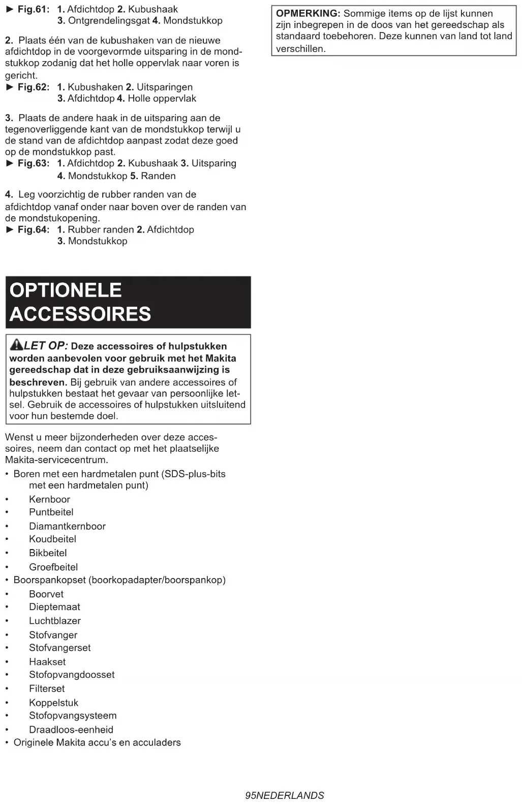►Fig.41 AVISO: Cuando limpie el ltro, golpee la caja del ltro suavemente con la mano para retirar el polvo. No golpee el ltro directamente; no toque el ltro con un cepillo o similar; ni sople el ltro con aire comprimido. Si lo hace podrá dañar el ltro. Soplador Accesorio opcional Despuésdeperforarunoricio,utiliceelsopladorpara limpiarelpolvodeloricio. ►Fig.42 Utilización del juego colector de polvo Accesorio opcional Encajeeljuegocolectordepolvocontraeltecho cuando utilice la herramienta. ►Fig.43 AVISO: No utilice el juego colector de polvo para perforar en metal o un material similar. Esto podría dañar el juego colector de polvo debido al calor producido por las pequeñas partículas metálicas u otras partículas similares. AVISO: No instale ni extraiga el juego colector de polvo si la broca está instalada en la herramienta. Esto podría dañar el juego colector de polvo y hacer que el polvo se ltre.108 ESPAÑOL