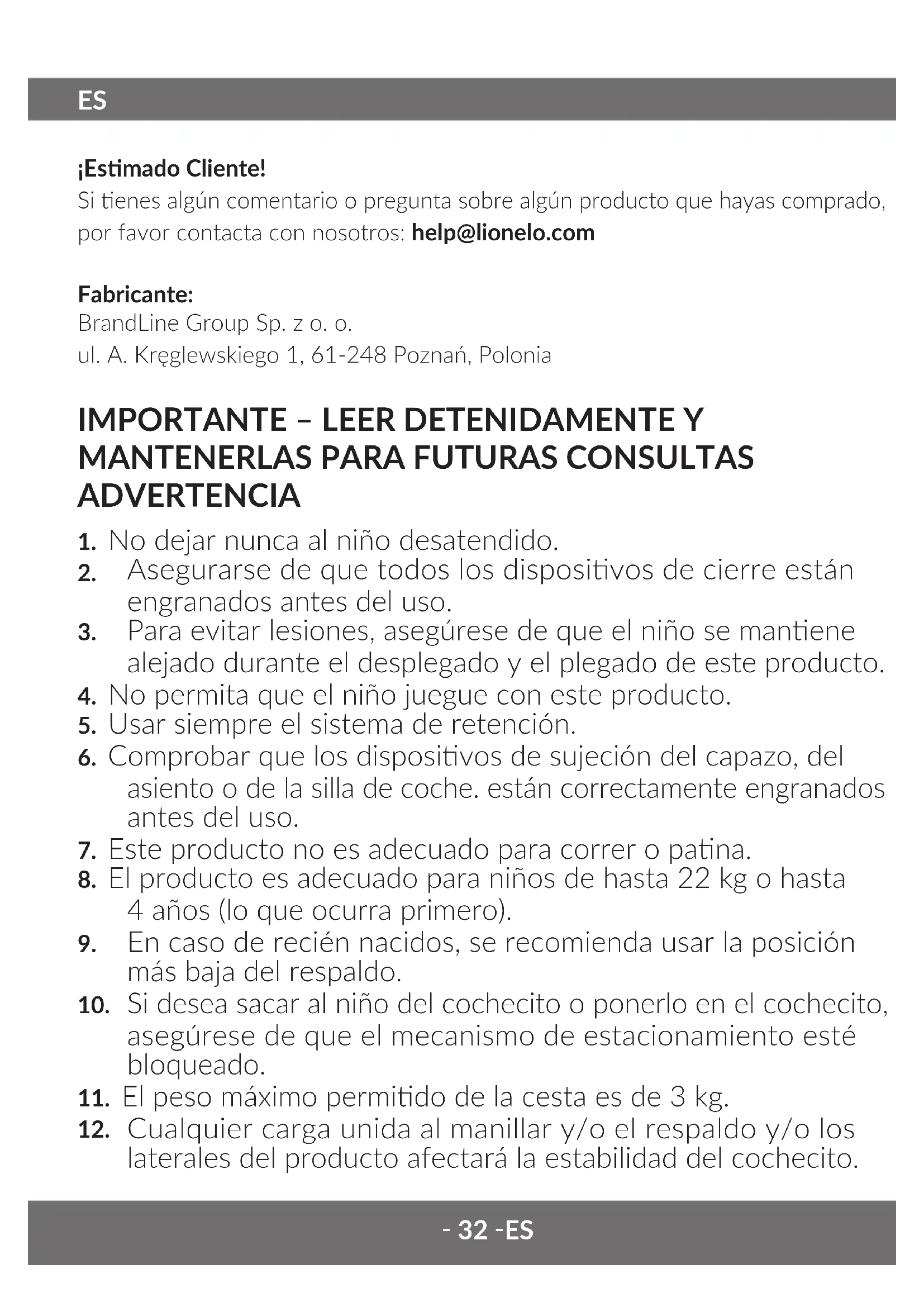 ¡Esmado Cliente! Si enes algún comentario o pregunta sobre algún producto que hayas comprado, por favor contacta con nosotros: help@lionelo.com Fabricante: BrandLine Group Sp. z o. o. ul. A. Kręglewskiego 1, 61-248 Poznań, Polonia