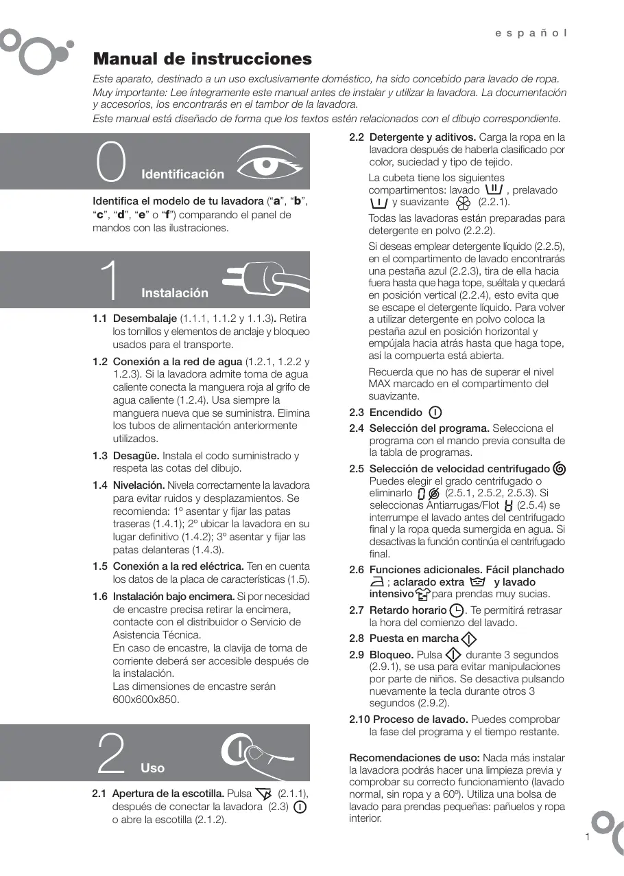 e s p a ñ o l Manual de instrucciones Este aparato, destinado a un uso exclusivamente doméstico, ha sido concebido para lavado de ropa. Muy importante: Lee íntegramente este manual antes de instalar y utilizar la lavadora. La documentación y accesorios, los encontrarás en el tambor de la lavadora. Este manual está diseñado de forma que los textos estén relacionados con el dibujo correspondiente.