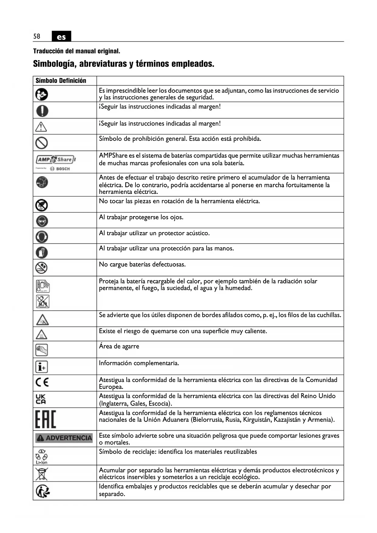 Traducción del manual original. Simbología, abreviaturas y términos empleados. Símbolo Definición Es imprescindible leer los documentos que se adjuntan, como las instrucciones de servicio y las instrucciones generales de seguridad. ¡Seguir las instrucciones indicadas al margen! ¡Seguir las instrucciones indicadas al margen! Símbolo de prohibición general. Esta acción está prohibida. AMPShare es el sistema de baterías compartidas que permite utilizar muchas herramientas de muchas marcas profesionales con una sola batería. Antes de efectuar el trabajo descrito retire primero el acumulador de la herramienta eléctrica. De lo contrario, podría accidentarse al ponerse en marcha fortuitamente la herramienta eléctrica. No tocar las piezas en rotación de la herramienta eléctrica. Al trabajar protegerse los ojos. Al trabajar utilizar un protector acústico. Al trabajar utilizar una protección para las manos. No cargue baterías defectuosas. Proteja la batería recargable del calor, por ejemplo también de la radiación solar permanente, el fuego, la suciedad, el agua y la humedad. Se advierte que los útiles disponen de bordes afilados como, p. ej., los filos de las cuchillas. Existe el riesgo de quemarse con una superficie muy caliente. Área de agarre Información complementaria. Atestigua la conformidad de la herramienta eléctrica con las directivas de la Comunidad Europea. Atestigua la conformidad de la herramienta eléctrica con las directivas del Reino Unido (Inglaterra, Gales, Escocia). Atestigua la conformidad de la herramienta eléctrica con los reglamentos técnicos nacionales de la Unión Aduanera (Bielorrusia, Rusia, Kirguistán, Kazajistán y Armenia). Este símbolo advierte sobre una situación peligrosa que puede comportar lesiones graves o mortales. Símbolo de reciclaje: identifica los materiales reutilizables Acumular por separado las herramientas eléctricas y demás productos electrotécnicos y eléctricos inservibles y someterlos a un reciclaje ecológico. Identifica embalajes y productos reciclables que se deberán acumular y desechar por separado. max.50°C ADVERTENCIA59