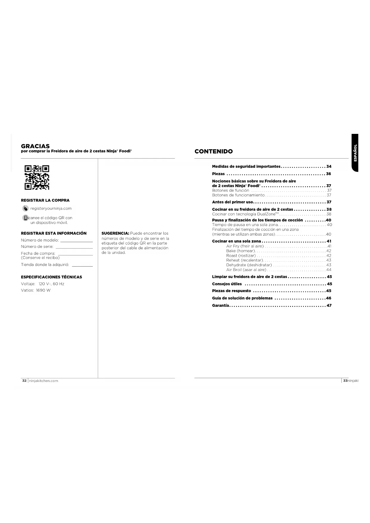 - registeryourninja.com Escanee el código QR con un dispositivo móvil. GRACIAS por comprar la Freidora de aire de 2 cestas Ninja® Foodi® Medidas de seguridad importantes p. 34