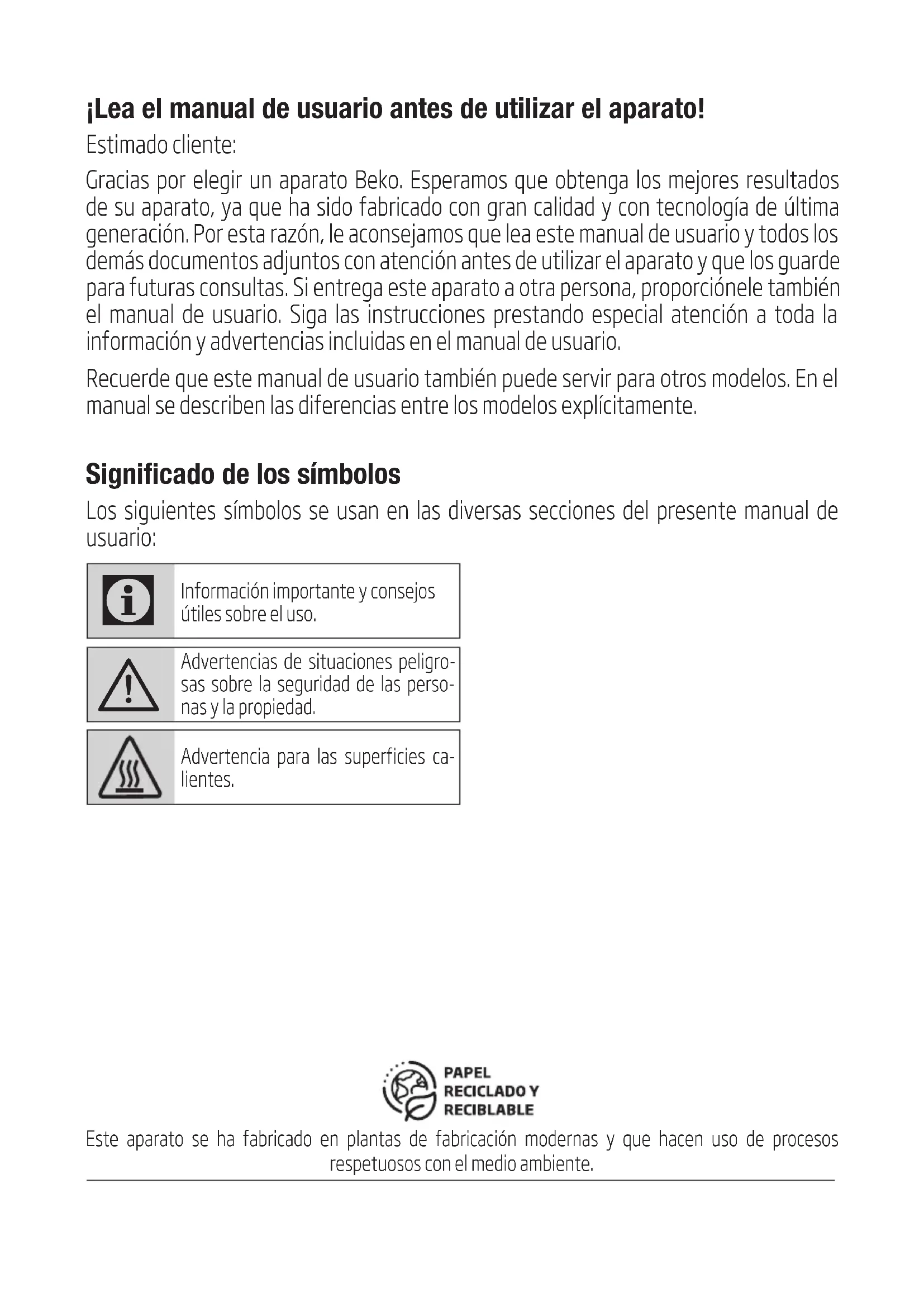 Prima di contattare l’assistenza tecnica, al ne di agevolare la gestione della chiamata, è necessario avere a portata di mano il modello del prodotto e il documento scale di acquisto.¡Lea el manual de usuario antes de utilizar el aparato! Estimado cliente: Gracias por elegir un aparato Beko. Esperamos que obtenga los mejores resultados de su aparato, ya que ha sido fabricado con gran calidad y con tecnología de última generación. Por esta razón, le aconsejamos que lea este manual de usuario y todos los demás documentos adjuntos con atención antes de utilizar el aparato y que los guarde para futuras consultas. Si entrega este aparato a otra persona, proporciónele también el manual de usuario. Siga las instrucciones prestando especial atención a toda la información y advertencias incluidas en el manual de usuario. Recuerde que este manual de usuario también puede servir para otros modelos. En el manual se describen las diferencias entre los modelos explícitamente. Significado de los símbolos Los siguientes símbolos se usan en las diversas secciones del presente manual de usuario: