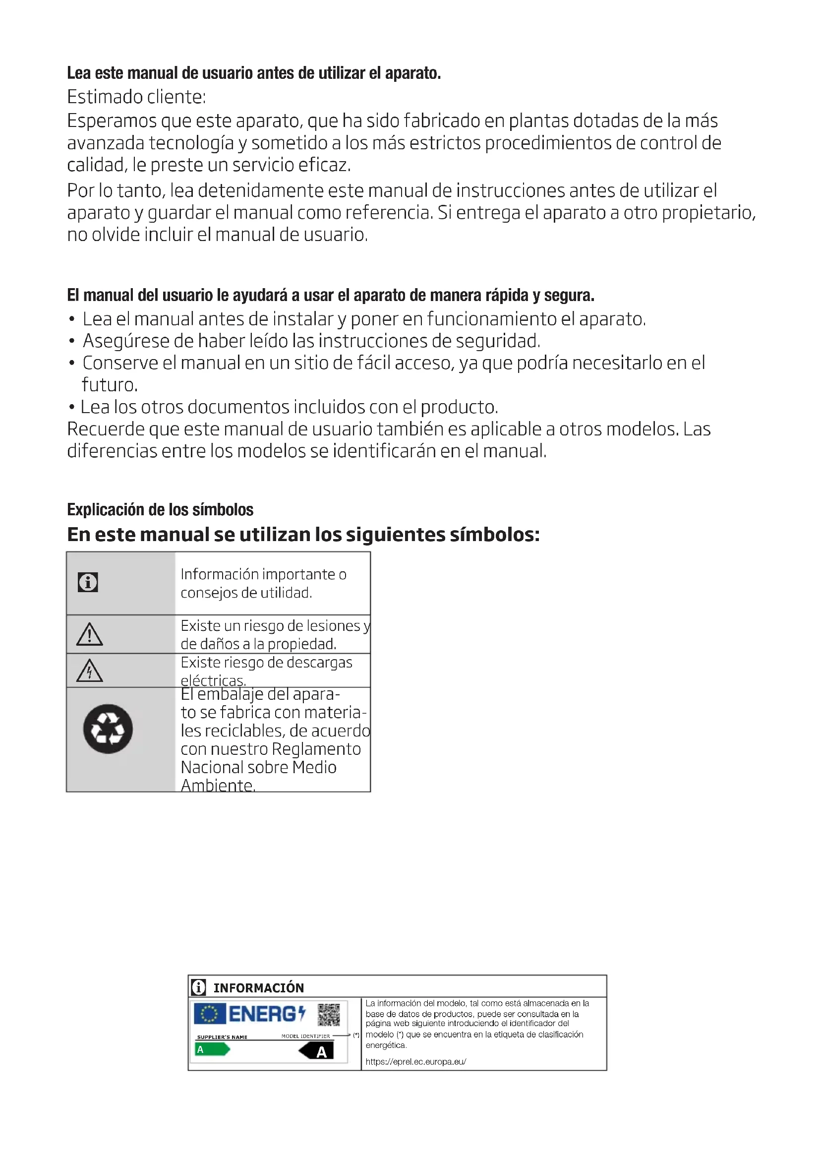Información importante o consejos de utilidad. Existe un riesgo de lesiones y de daños a la propiedad. Existe riesgo de descargas eléctricas.El embalaje del apara-to se fabrica con materia-les reciclables, de acuerdo con nuestro Reglamento Nacional sobre Medio Ambiente.INFORMACIÓN La información del modelo, tal como está almacenada en la base de datos de productos, puede ser consultada en la página web siguiente introduciendo el identificador del modelo (*) que se encuentra en la etiqueta de clasificación energética.https://eprel.ec.europa.eu/