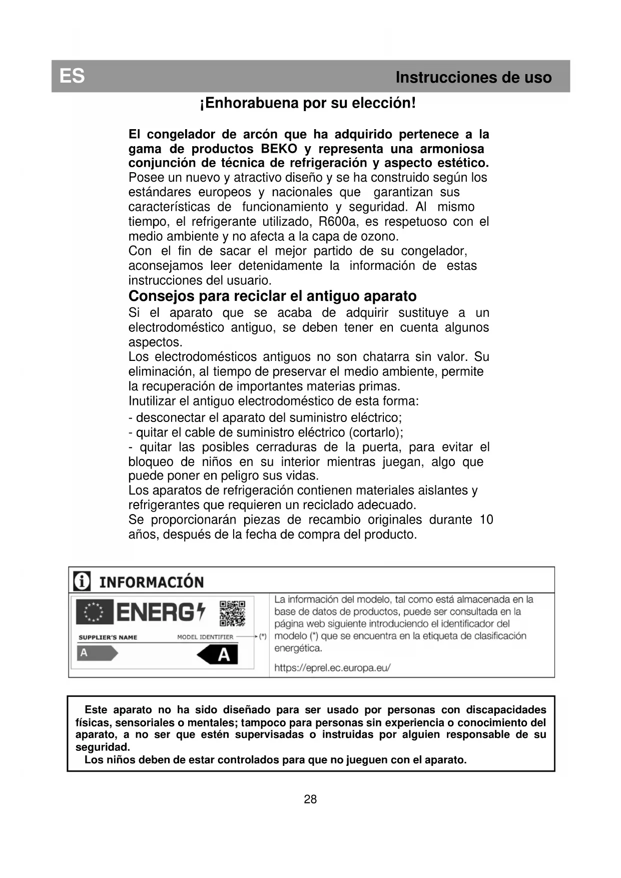 Il simbolo sul prodotto o sulla confezione indica che questo prodotto non può essere trattato come normale rifiuto domestico. Invece deve essere portato al punto di raccolta adatto per il riciclaggio delle apparecchiature elettriche ed elettroniche. Assicurando il corretto smaltimento di questo prodotto, si evitano potenziali conseguenze negative per l’ambiente e la salute, che potrebbero derivare da una gestione inappropriata del prodotto. Per informazioni più dettagliate sul riciclaggio di questo prodotto, contattare l’ufficio cittadino locale, il servizio di smaltimento dei rifiuti domestici o il negozio dove è stato acquistato il prodotto.¡Enhorabuena por su elección! El congelador de arcón que ha adquirido pertenece a la gama de productos BEKO y representa una armoniosa conjunción de técnica de refrigeración y aspecto estético. Posee un nuevo y atractivo diseño y se ha construido según los estándares europeos y nacionales que garantizan sus características de funcionamiento y seguridad. Al mismo tiempo, el refrigerante utilizado, R600a, es respetuoso con el medio ambiente y no afecta a la capa de ozono. Con el fin de sacar el mejor partido de su congelador, aconsejamos leer detenidamente la información de estas instrucciones del usuario. Consejos para reciclar el antiguo aparato Si el aparato que se acaba de adquirir sustituye a un electrodoméstico antiguo, se deben tener en cuenta algunos aspectos. Los electrodomésticos antiguos no son chatarra sin valor. Su eliminación, al tiempo de preservar el medio ambiente, permite la recuperación de importantes materias primas. Inutilizar el antiguo electrodoméstico de esta forma: - desconectar el aparato del suministro eléctrico; - quitar el cable de suministro eléctrico (cortarlo); - quitar las posibles cerraduras de la puerta, para evitar el bloqueo de niños en su interior mientras juegan, algo que puede poner en peligro sus vidas. Los aparatos de refrigeración contienen materiales aislantes y refrigerantes que requieren un reciclado adecuado. Se proporcionarán piezas de recambio originales durante 10 años, después de la fecha de compra del producto. ES Instrucciones de uso Este aparato no ha sido diseñado para ser usado por personas con discapacidades físicas, sensoriales o mentales; tampoco para personas sin experiencia o conocimiento del aparato, a no ser que estén supervisadas o instruidas por alguien responsable de su seguridad. Los niños deben de estar controlados para que no jueguen con el aparato. 28ES Instrucciones de uso Reciclado del embalaje ADVERTENCIA No deje que los niños jueguen con el embalaje o con alguna parte del mismo. Existe el riesgo de asfixia con las partes del cartón ondulado y con la película de plástico. Para que llegue a usted en buenas condiciones, el aparato se ha protegido con un embalaje apropiado. Todos los materiales del embalaje son compatibles con el medio ambiente y son reciclables. Por favor, ayúdenos a reciclar el embalaje al tiempo que se protege el medio ambiente. IMPORTANTE: Antes de poner en marcha el electrodoméstico, leer detenidamente estas instrucciones en su totalidad. Contienen información importante relativa a la instalación, uso y mantenimiento del aparato. El fabricante no asume ninguna responsabilidad si no se cumplen las instrucciones de este documento. Guarde las instrucciones en un lugar seguro para tenerlas a mano en caso de necesidad. Pueden resultarles útiles a los usuarios posteriores. ¡ATE N CIÓN! Este electrodoméstico sólo debe usarse para su finalidad prevista (uso doméstico), en zonas apropiadas, lejos de la lluvia, la humedad o cualquier otro fenómeno meteorológico. Instrucciones de transporte En la medida de lo posible, el aparato se debe transportar solamente en posición vertical. Durante el transporte el embalaje debe estar en perfectas condiciones. Si durante el transporte el electrodoméstico se colocó en posición horizontal (solamente según las marcas del embalaje), se aconseja que, antes de poner el electrodoméstico en funcionamiento, se deje sin actividad durante 4 horas, con el fin de permitir la estabilización del circuito refrigerante. Si no se cumplen estas instrucciones, se puede provocar la avería del compresor del motor y la cancelación de su garantía. Advertencias y consejos generales No enchufar el aparato si se advierte un fallo. Las reparaciones sólo deben hacerse por personal cualificado. En las siguientes situaciones desenchufar el aparato de la red eléctrica: - al deshelar completamente el aparato; - al limpiar el aparato. Para desenchufar el electrodoméstico, tirar del enchufe, no del cable. Asegurarse de que existe el mínimo espacio entre el aparato y la pared frente a la que está colocado. No subirse encima del aparato. No dejar que los niños jueguen o se escondan dentro del aparato. No utilizar nunca aparatos eléctricos dentro del congelador para deshelar. No utilizar el electrodoméstico cerca de aparatos de calefacción, cocinas o cualquier otra fuente de calor y fuego. No dejar abierta la puerta del congelador más de lo necesario para meter o sacar los alimentos. No dejar los alimentos en el electrodoméstico si no está en funcionamiento. No tener dentro productos que contengan gases inflamables o explosivos. No tener en el congelador bebidas gaseosas (zumos, agua mineral, champán, etc.): ¡la botella puede explotar! No congelar bebidas en botellas de plástico. No tomar cubitos de hielo o helado inmediatamente después de haberlos sacado del congelador, porque pueden provocar "quemaduras" en los labios. No tocar nunca las partes metálicas frías o la comida congelada con las manos húmedas, porque sus manos se pueden congelar rápidamente en las superficies muy frías. Para proteger la aplicación durante su almacenamiento o traslado, se provee con separadores entre la puerta y el gabinete (en la parte frontal y trasera). Estos separadores se eliminarán antes de poner la apl
