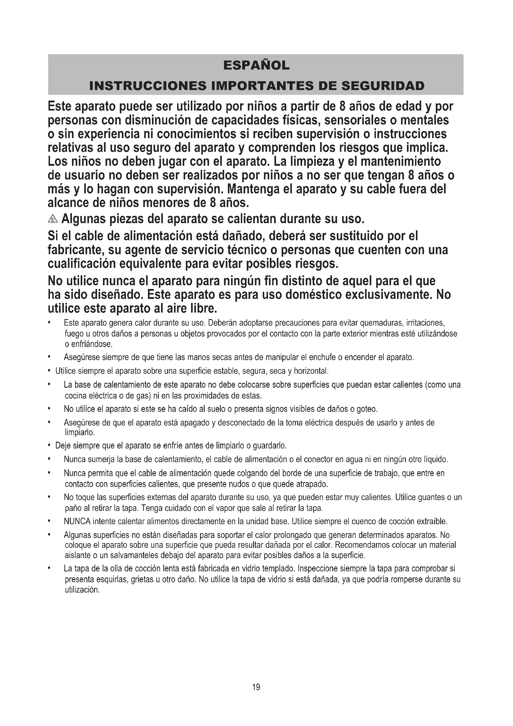 Este aparato puede ser utilizado por niños a partir de 8 años de edad y por personas con disminución de capacidades físicas, sensoriales o mentales o sin experiencia ni conocimientos si reciben supervisión o instrucciones relativas al uso seguro del aparato y comprenden los riesgos que implica. Los niños no deben jugar con el aparato. La limpieza y el mantenimiento de usuario no deben ser realizados por niños a no ser que tengan 8 años o más y lo hagan con supervisión. Mantenga el aparato y su cable fuera del alcance de niños menores de 8 años. Algunas piezas del aparato se calientan durante su uso. Si el cable de alimentación está dañado, deberá ser sustituido por el fabricante, su agente de servicio técnico o personas que cuenten con una cualificación equivalente para evitar posibles riesgos. No utilice nunca el aparato para ningún fin distinto de aquel para el que ha sido diseñado. Este aparato es para uso doméstico exclusivamente. No utilice este aparato al aire libre.