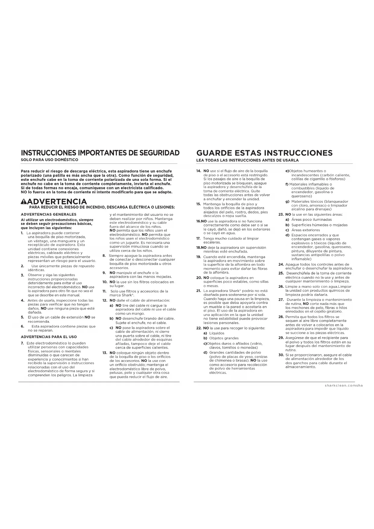 1 Utilice el borde de una moneda para cerrar los tres bloqueos en la parte inferior de la boquilla de piso. Pase unas tijeras sobre la ranura del cepillo giratorio para cortar o eliminar hilos, fibras de alfombra, cabello u otros escombros. 3 Para colocar la cubierta de nuevo, alinéela, luego gírela hacia abajo hasta que se escuche un clic. Utilice el borde de una moneda para cerrar los tres bloqueos en la parte inferior de la boquilla de piso. 1 2sharkclean.comsharkclean.com La garantía limitada cinco (5) año se aplica a las compras realizadas a los vendedores minoristas autorizados de SharkNinja Operating LLC. La cobertura de garantía se aplica solo al propietario y al producto originales, y no puede transferirse. SharkNinja garantiza que la unidad estará libre de defectos materiales y de mano de obra durante un período cinco (5) año desde la fecha de compra, siempre y cuando se use en condiciones domésticas normales y se efectúe su mantenimiento de acuerdo con los requisitos descritos en este manual del propietario, sujeto a las siguientes condiciones y exclusiones: ¿Qué cubre esta garantía?