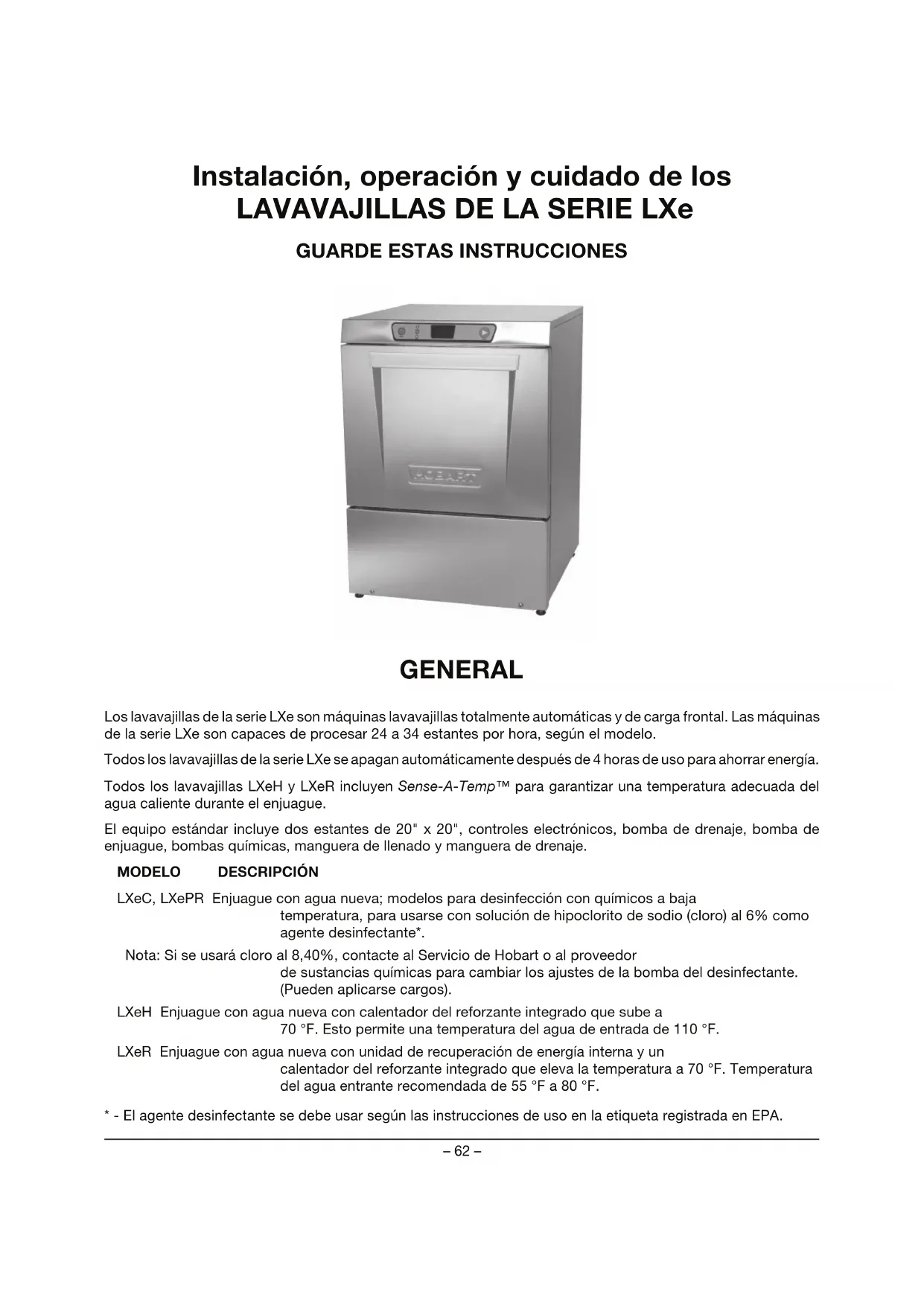 LXeC, LXePR Enjuague con agua nueva; modelos para desinfección con químicos a baja temperatura, para usarse con solución de hipoclorito de sodio (cloro) al 6% como agente desinfectante*. Nota: Si se usará cloro al 8,40%, contacte al Servicio de Hobart o al proveedor de sustancias químicas para cambiar los ajustes de la bomba del desinfectante. (Pueden aplicarse cargos). LXeH Enjuague con agua nueva con calentador del reforzante integrado que sube a 70 °F. Esto permite una temperatura del agua de entrada de 110 °F. LXeR Enjuague con agua nueva con unidad de recuperación de energía interna y un calentador del reforzante integrado que eleva la temperatura a 70 °F. Temperatura del agua entrante recomendada de 55 °F a 80 °F.