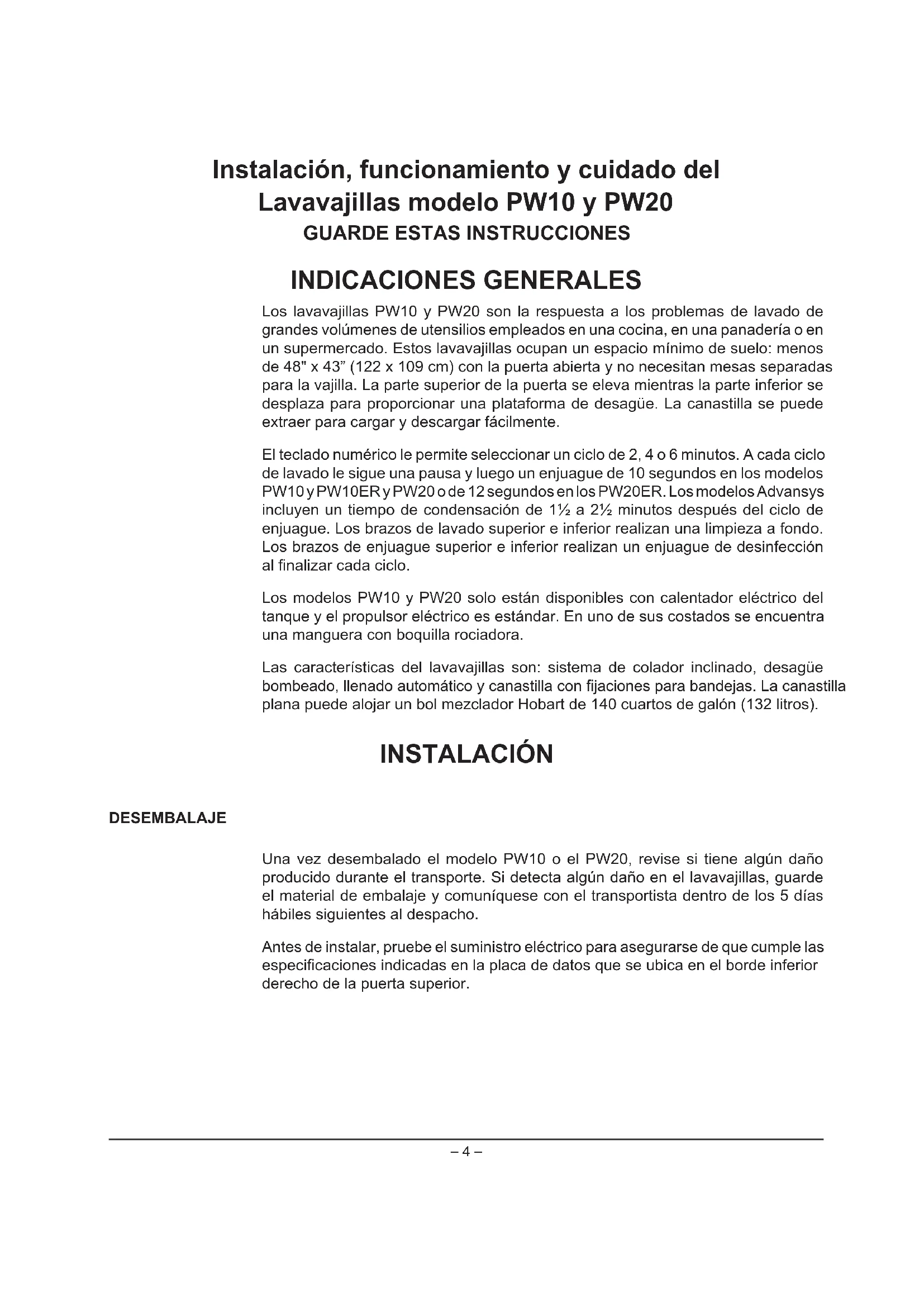INDICACIONES GENERALES Los lavavajillas PW10 y PW20 son la respuesta a los problemas de lavado de grandes volúmenes de utensilios empleados en una cocina, en una panadería o en un supermercado. Estos lavavajillas ocupan un espacio mínimo de suelo: menos de 48" x 43” (122 x 109 cm) con la puerta abierta y no necesitan mesas separadas para la vajilla. La parte superior de la puerta se eleva mientras la parte inferior se desplaza para proporcionar una plataforma de desagüe. La canastilla se puede extraer para cargar y descargar fácilmente. El teclado numérico le permite seleccionar un ciclo de 2, 4 o 6 minutos. A cada ciclo de lavado le sigue una pausa y luego un enjuague de 10 segundos en los modelos PW10 y PW10ER y PW20 o de 12 segundos en los PW20ER. Los modelos Advansys incluyen un tiempo de condensación de 1½ a 2½ minutos después del ciclo de enjuague. Los brazos de lavado superior e inferior realizan una limpieza a fondo. Los brazos de enjuague superior e inferior realizan un enjuague de desinfección al nalizar cada ciclo. Los modelos PW10 y PW20 solo están disponibles con calentador eléctrico del tanque y el propulsor eléctrico es estándar. En uno de sus costados se encuentra una manguera con boquilla rociadora. Las características del lavavajillas son: sistema de colador inclinado, desagüe bombeado, llenado automático y canastilla con jaciones para bandejas. La canastilla plana puede alojar un bol mezclador Hobart de 140 cuartos de galón (132 litros). INSTALACIÓN DESEMBALAJE Una vez desembalado el modelo PW10 o el PW20, revise si tiene algún daño producido durante el transporte. Si detecta algún daño en el lavavajillas, guarde el material de embalaje y comuníquese con el transportista dentro de los 5 días hábiles siguientes al despacho. Antes de instalar, pruebe el suministro eléctrico para asegurarse de que cumple las especicaciones indicadas en la placa de datos que se ubica en el borde inferior derecho de la puerta superior.– 5 – Desembalaje desde el palet Desembale cuidadosamente el lavavajillas desde el palet.